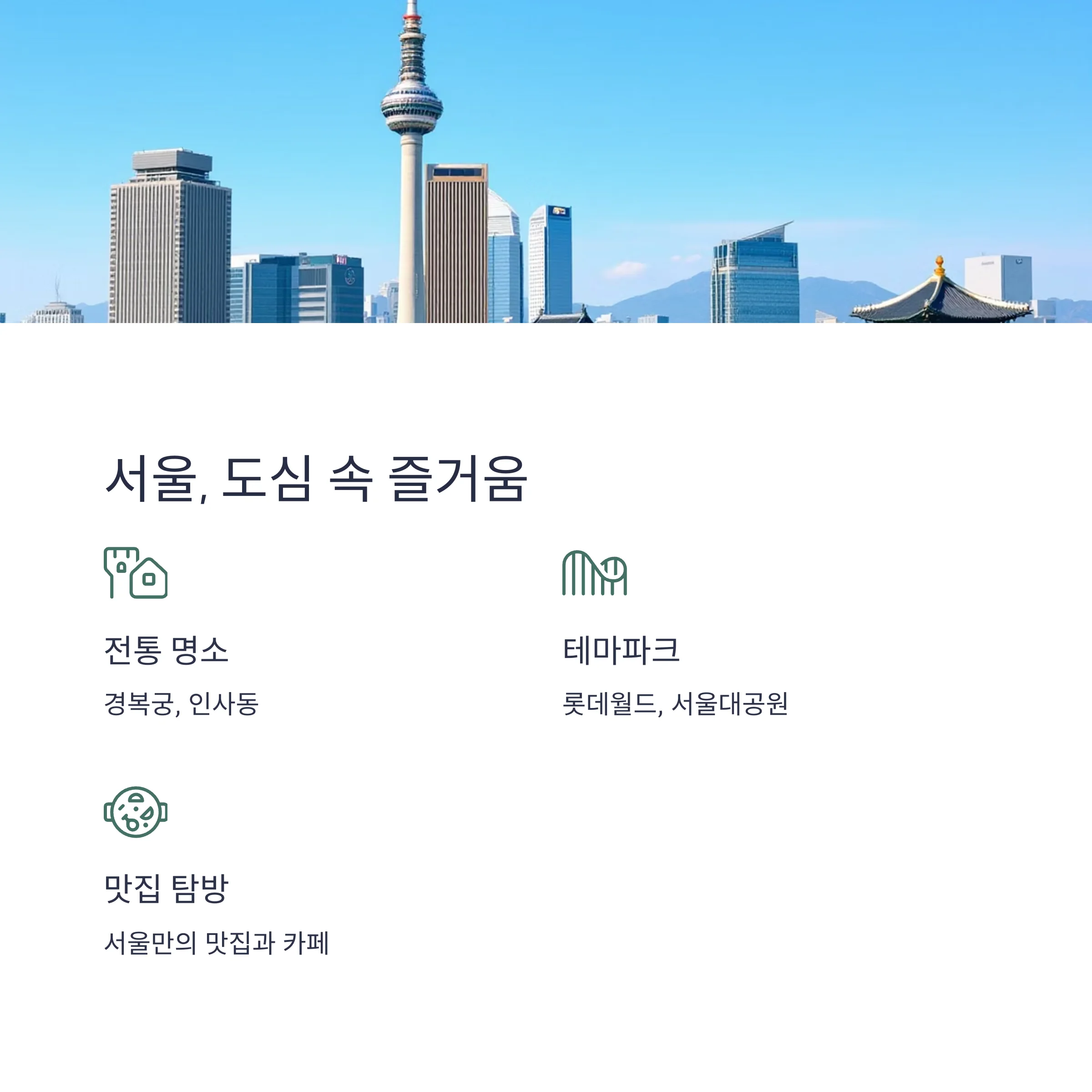 | 서울 | 경복궁, 롯데월드 | 한식, 남산타워 전망 |