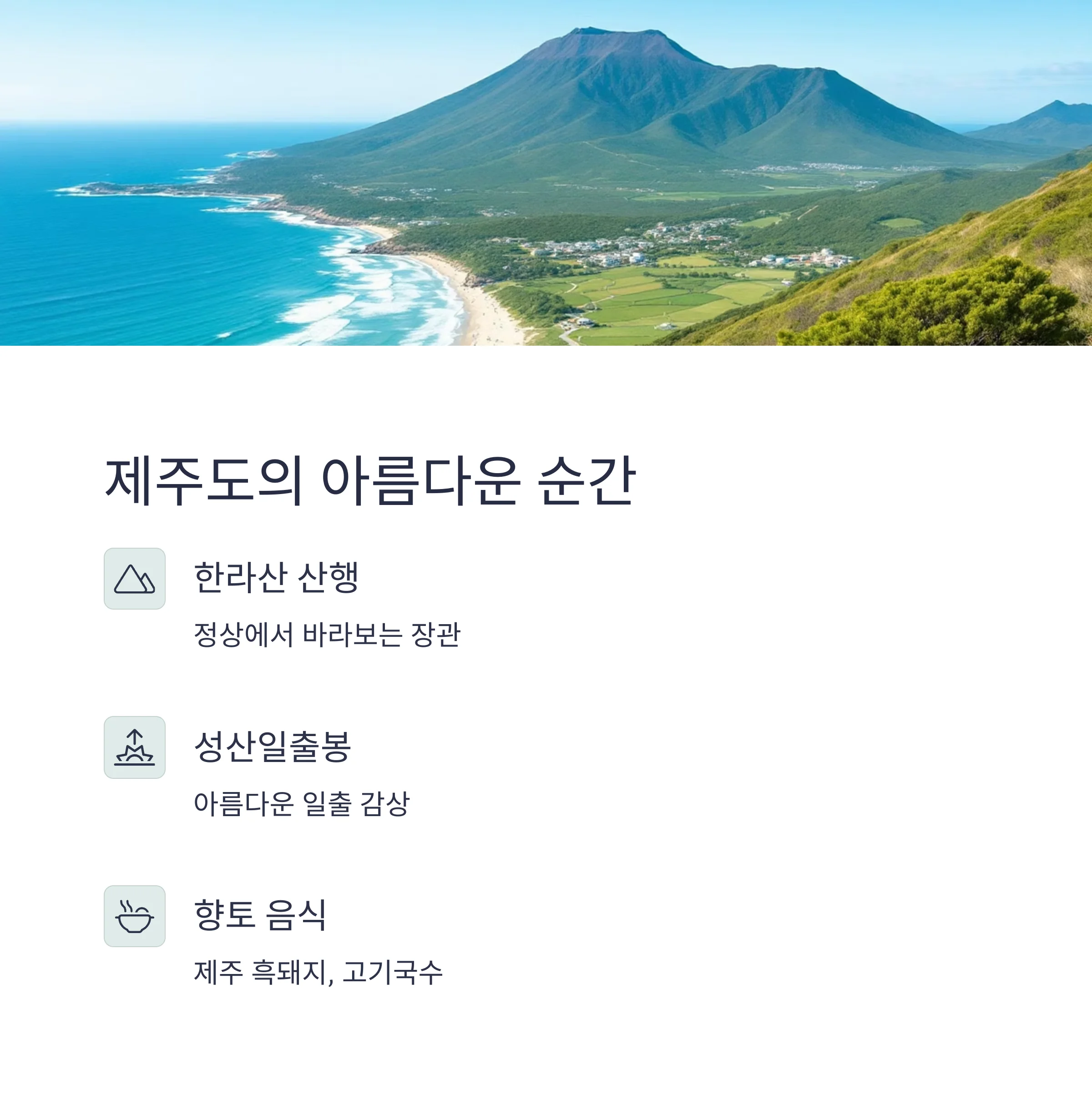 | 제주도 | 한라산, 올레길 | 흑돼지, 고기국수 |