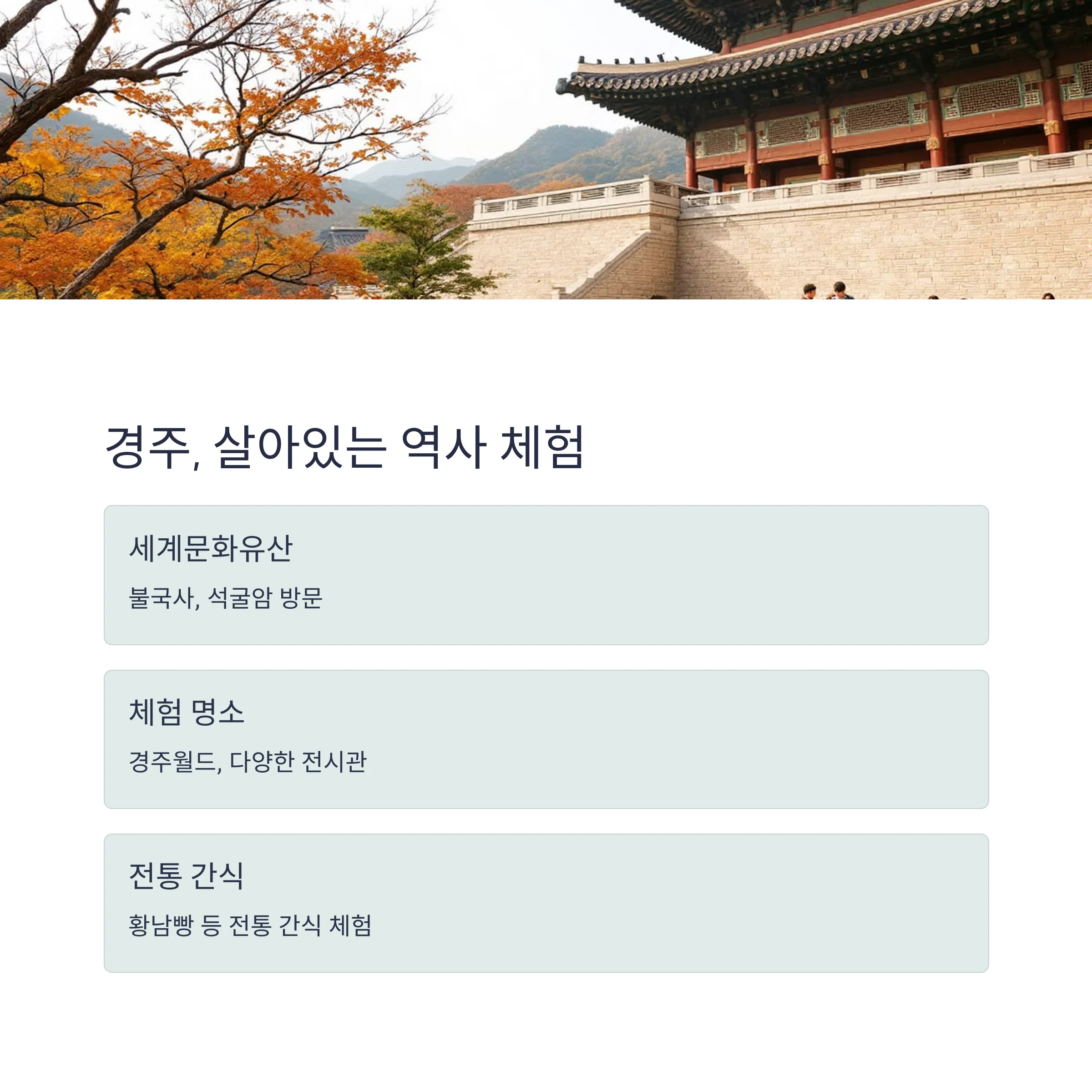 경주는 세계문화유산 불국사, 석굴암과 함께 역사적 가치가 높은 명소가 많아 아이들과 함께 의미 있는 여행을 할 수 있습니다. 놀이공원 경주월드, 다양한 체험 전시관, 황남빵과 같은 전통 간식 체험도 가족 여행에 즐거움을 더합니다.