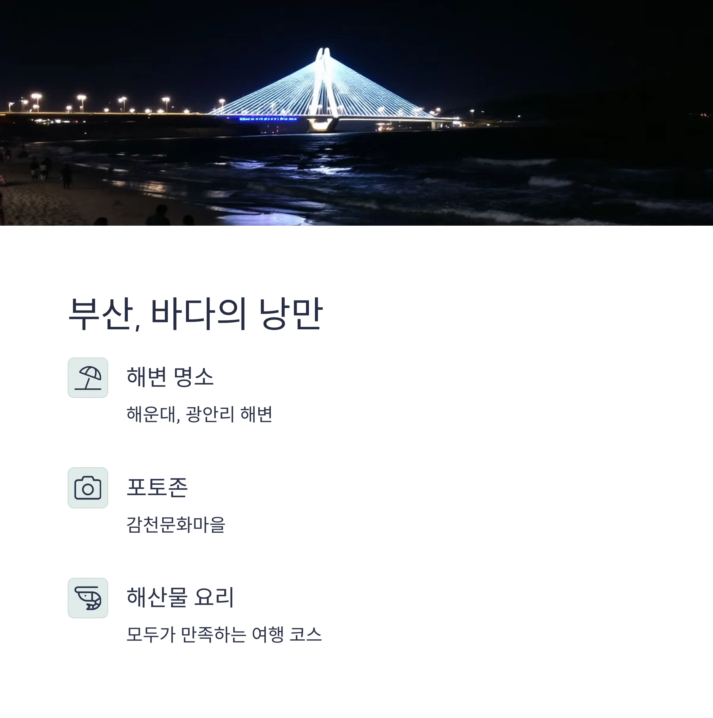 | 부산 | 해운대, 감천마을 | 해산물, 야경 |