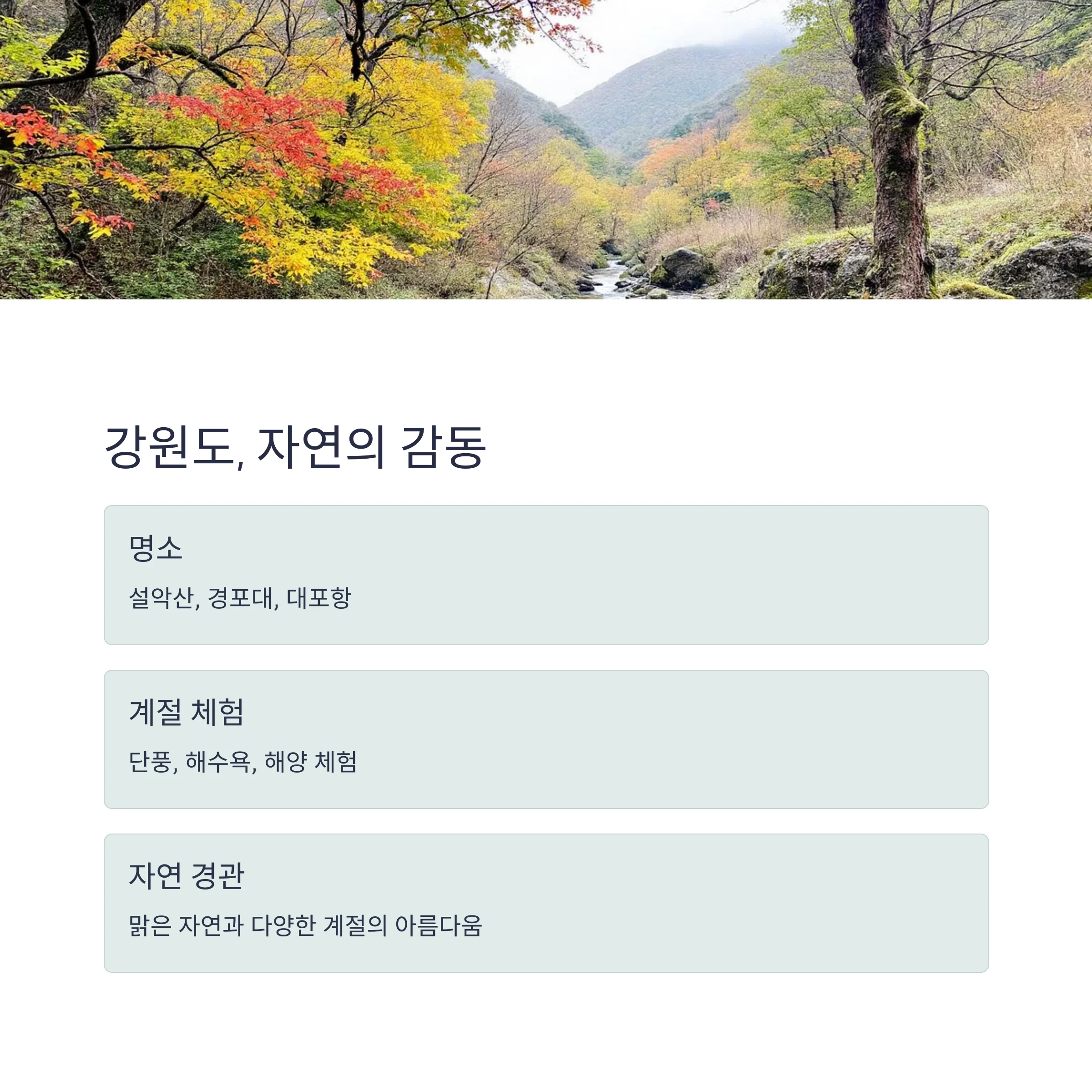 설악산, 경포대, 대포항 등 강원도는 맑은 자연과 다양한 계절의 아름다움을 만날 수 있는 지역입니다. 단풍, 해수욕, 해양 체험 등 계절에 따라 선택지도 넓어 가족 모두에게 특별한 경험이 될 것입니다.
