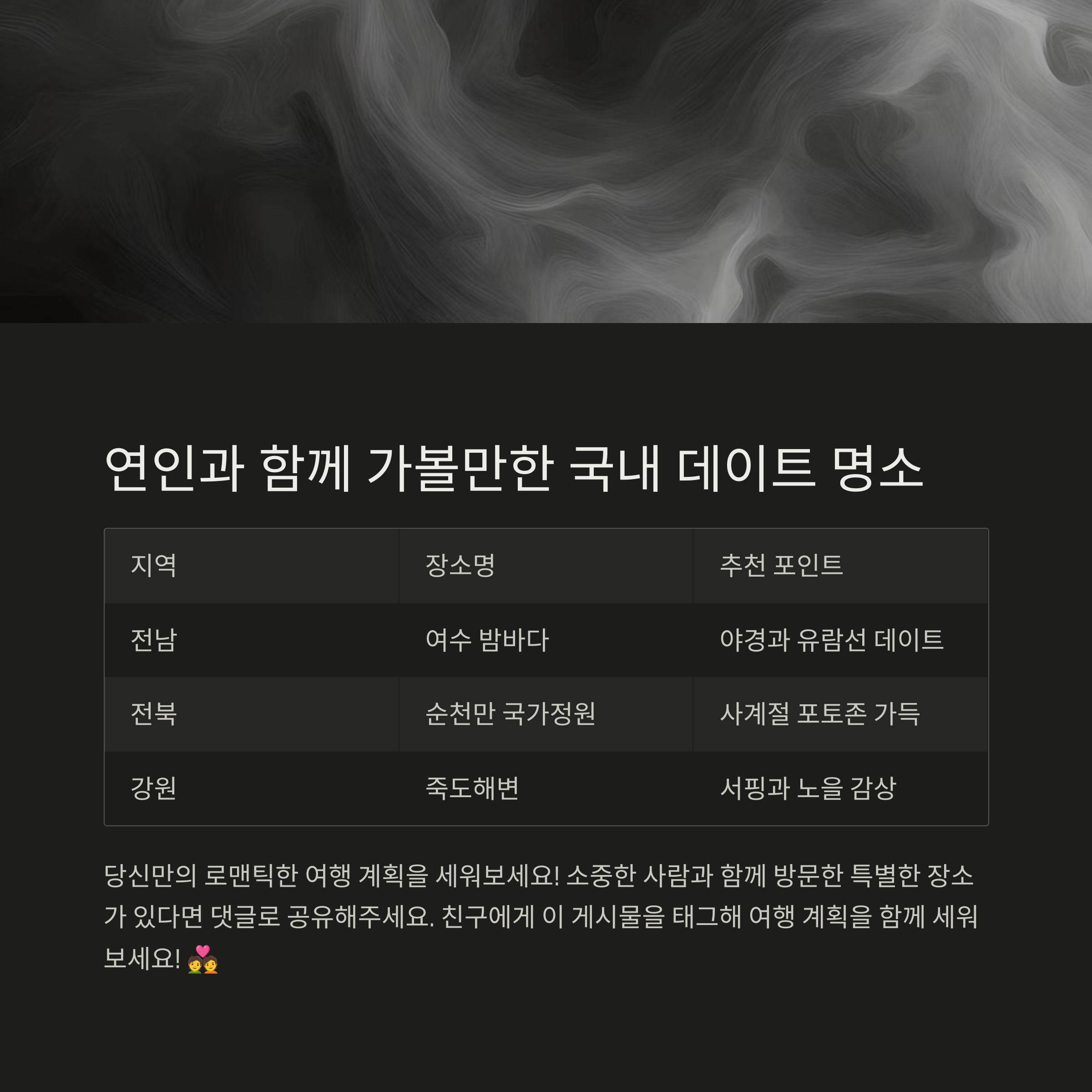 이번 글에서는 국내에서 연인과 함께 가기 좋은 감성적이고 로맨틱한 여행지를 지역별로 다양하게 소개해드립니다.