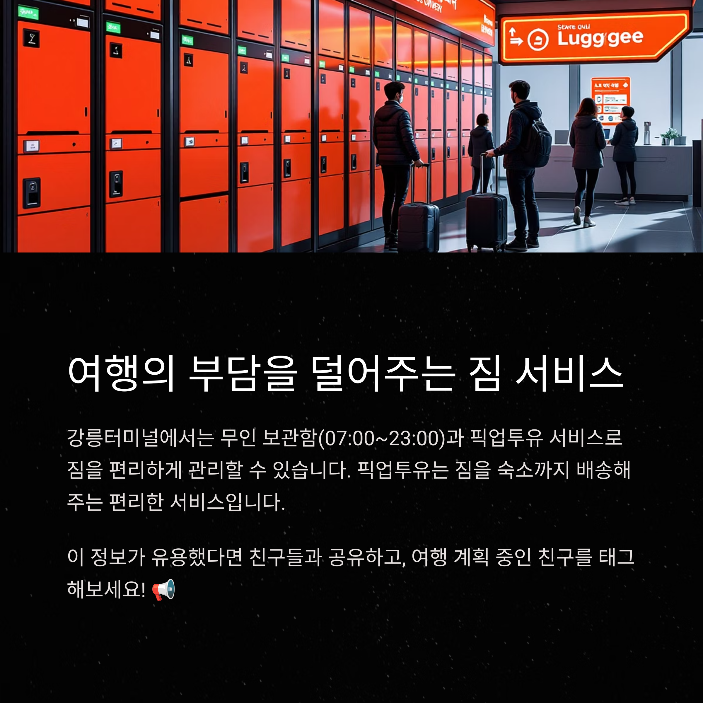 | 강릉시외버스터미널 안에는 무인 보관함과 픽업투유 서비스가 제공합니다. 무인 보관함은 메가커피 옆 출구 근처에 위치하며, 구조적으로 접근이 편리합니다. 픽업투유 서비스를 이용하면, 강릉역과 터미널 간 짐을 숙소까지 배송받을 수 있습니다. 운영 시간은 07:00부터 23:00까지로 모든 이용자에게 큰 편의를 제공합니다. 이 두 옵션은 강릉 여행 중 짐 관리 문제를 효과적으로 해결합니다. |