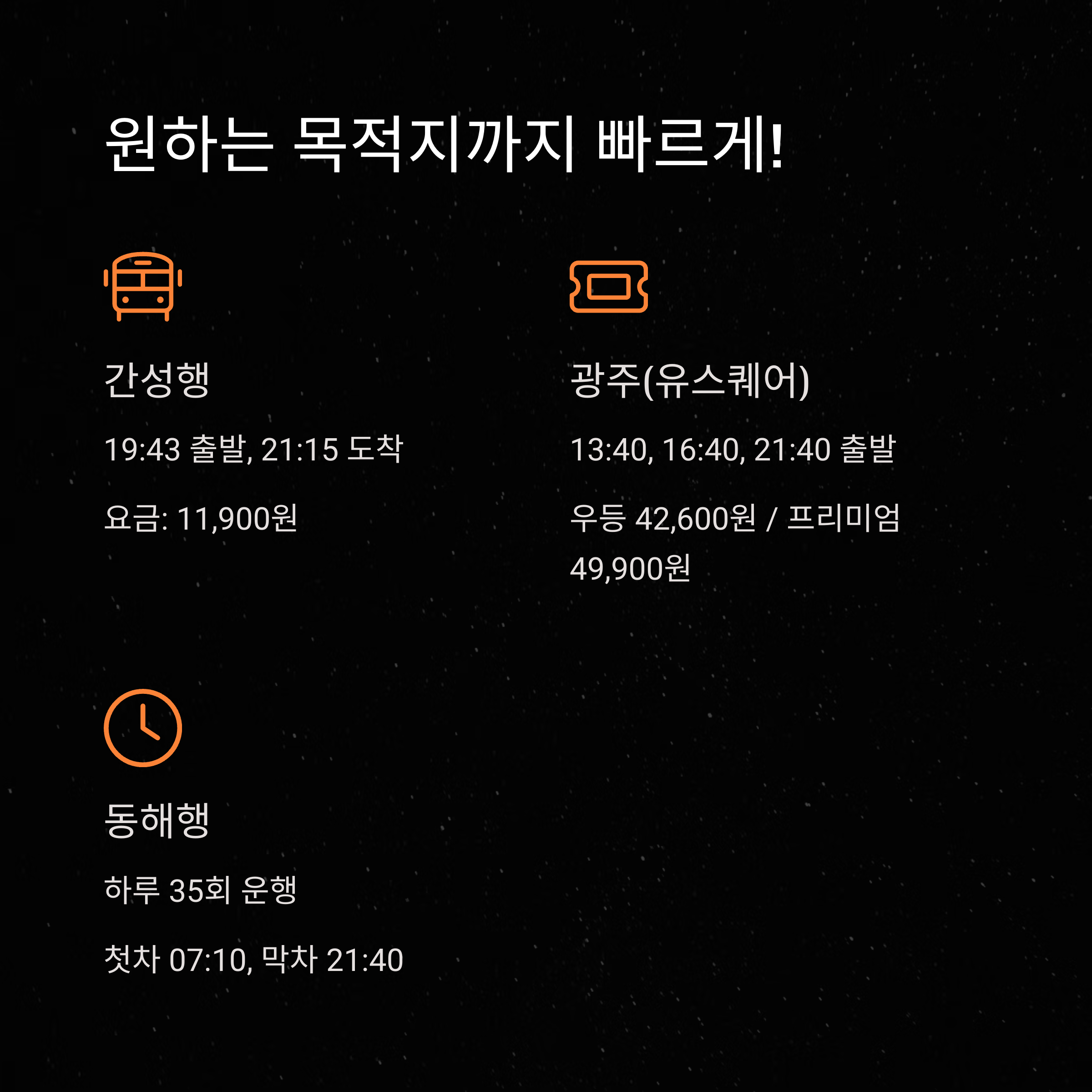 | 강릉 | 광주(유스퀘어) | 13:40, 16:40, 21:40 | 42,600원 - 49,900원 |