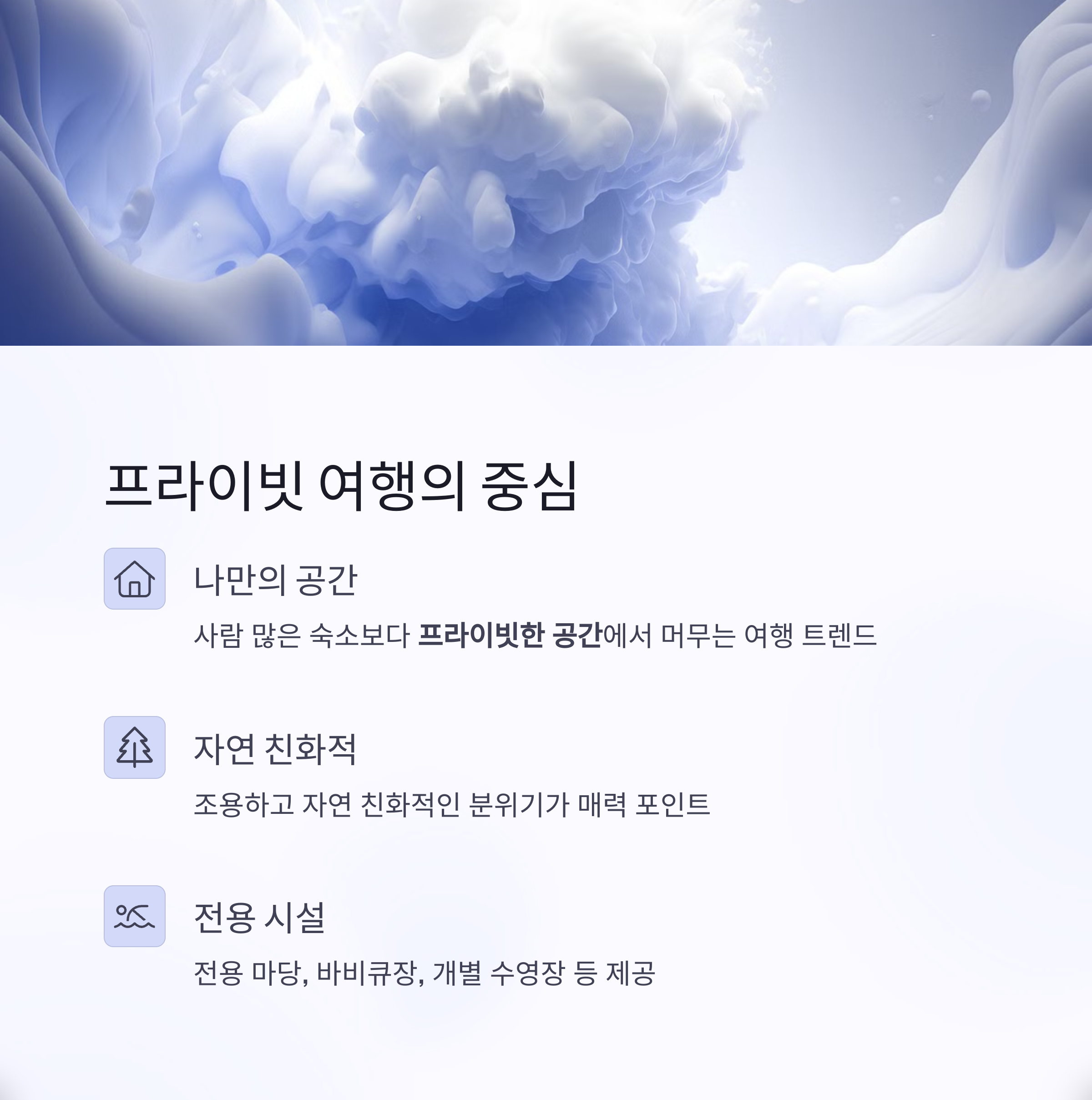 요즘은 사람 많은 숙소보다, '나만의 공간'에서 머무는 여행이 인기입니다.