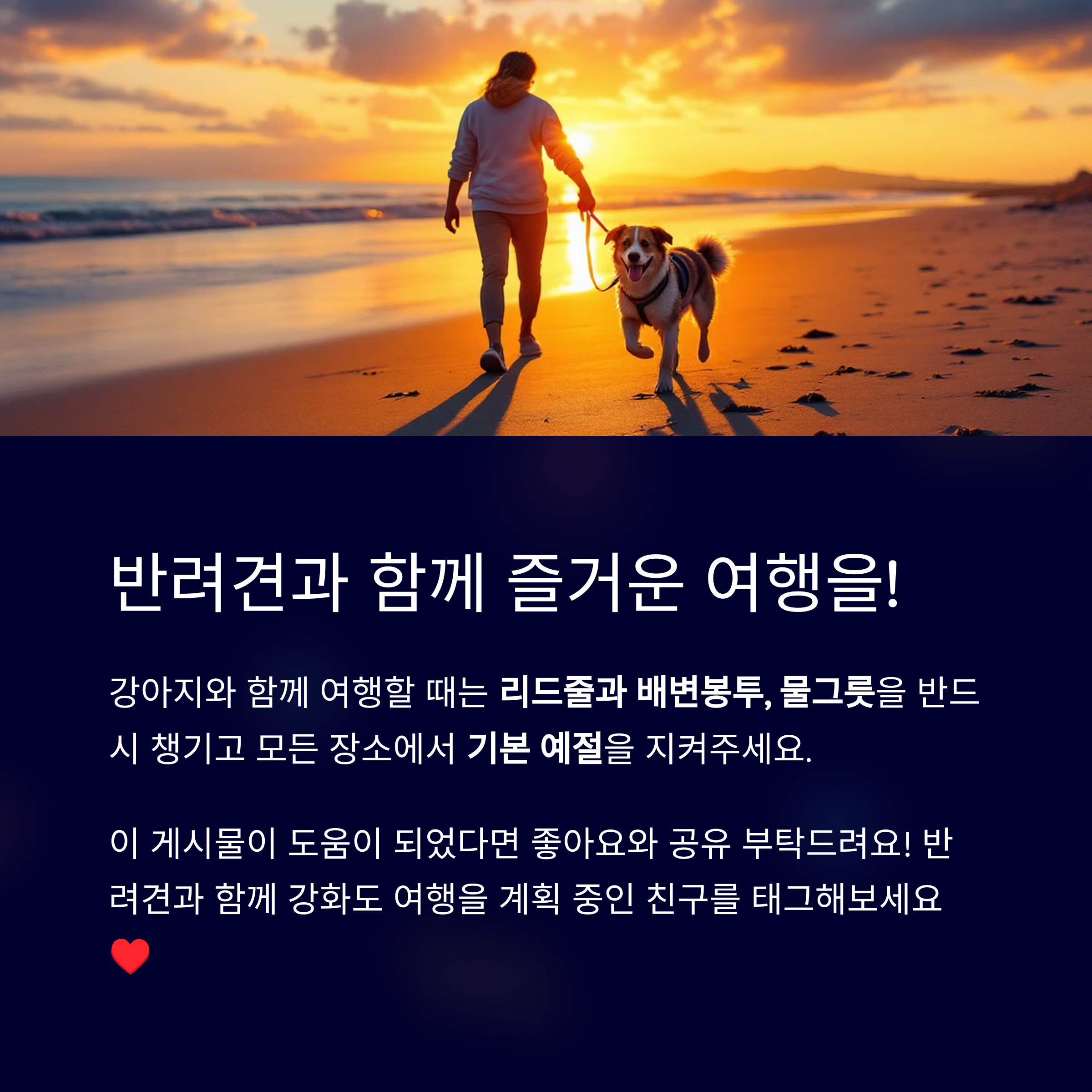 강화도는 자연과 바다가 어우러진 풍경 덕분에 반려견과 함께하기 좋은 여행지로 꼽힙니다.