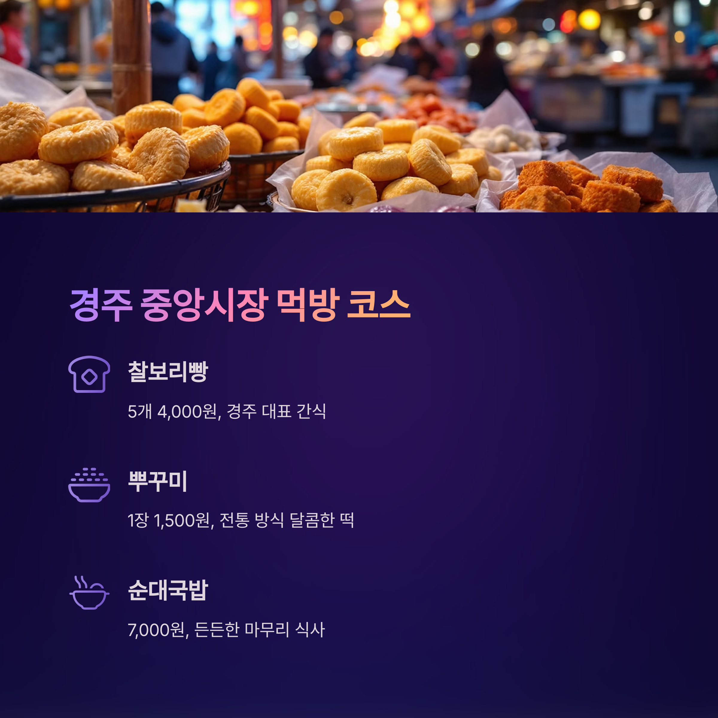 경주 중앙시장에서 "로컬 먹방 데이트"를 즐겨보세요.