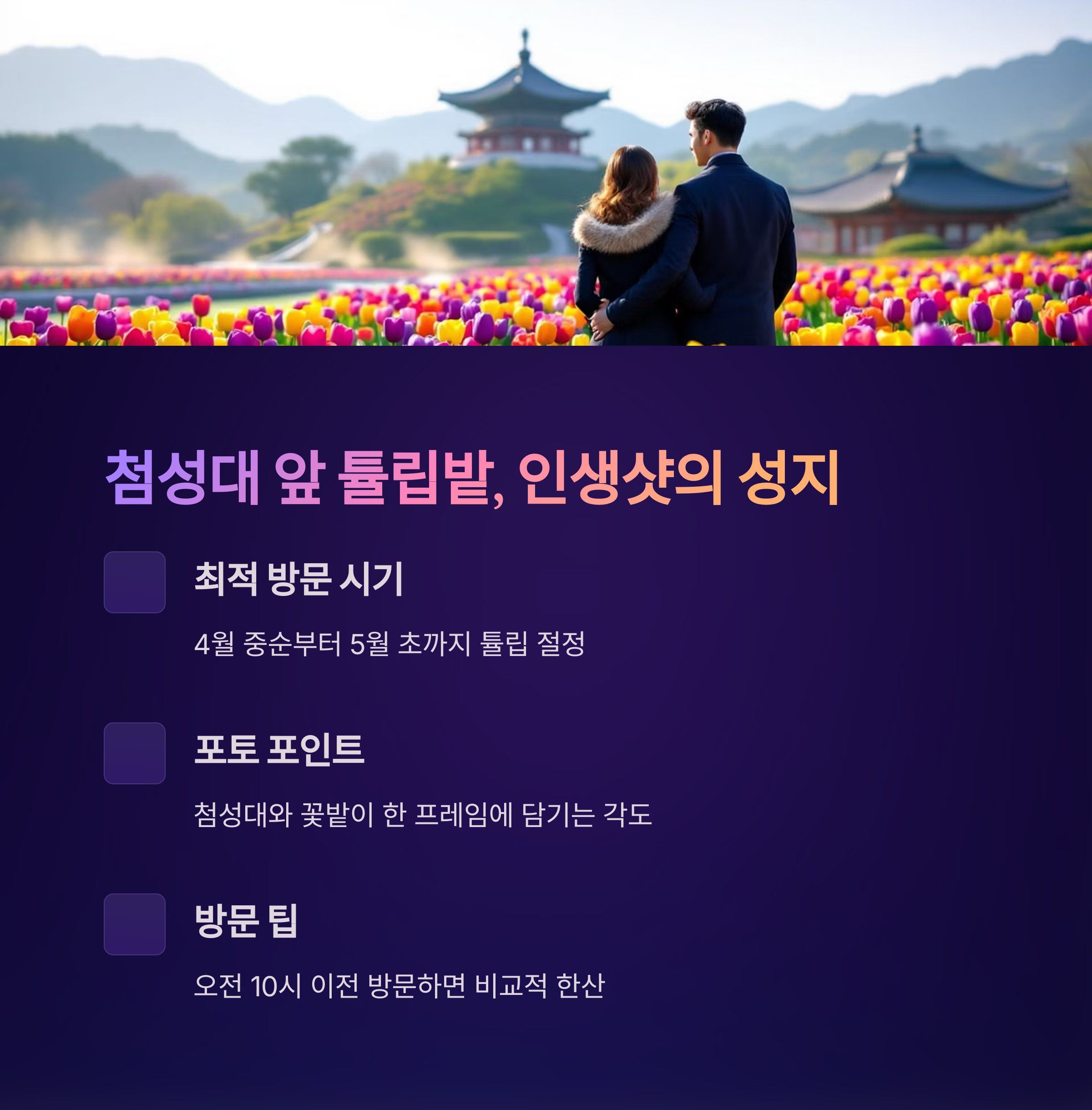 | 오전 9시 | 첨성대 튤립 + 인생샷 | 사람 적고 사진 찍기 좋음 |