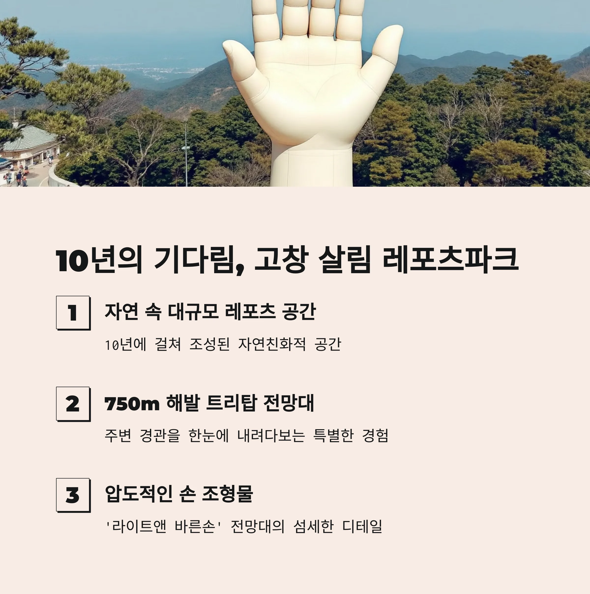 | 고창 살림 레포츠파크 | 트리탑 전망대, 손 조형물, 숲속의 집 | 일부 시설 미개장 |