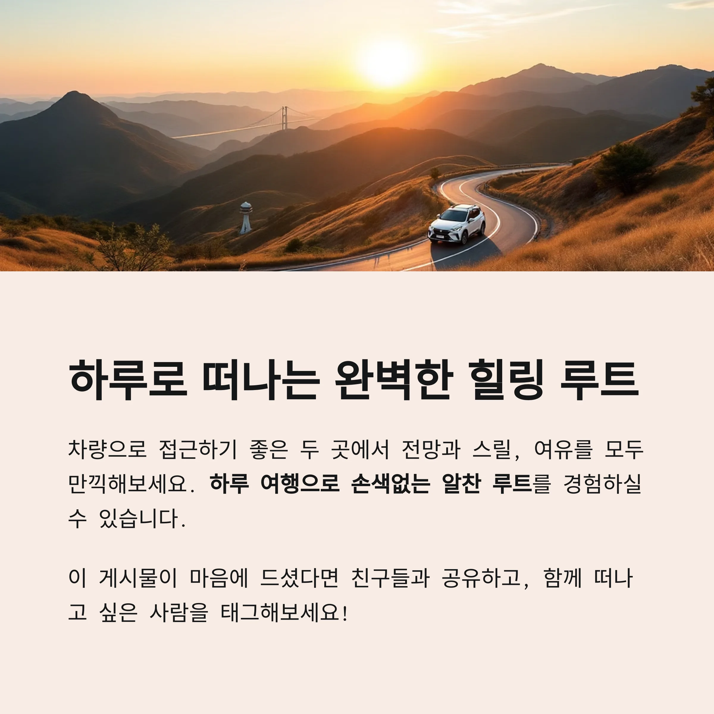 두 곳 모두 접근성이 차량 중심이긴 하지만, 그만큼 조용하고 넓은 자연 공간에서의 힐링이 가능합니다.