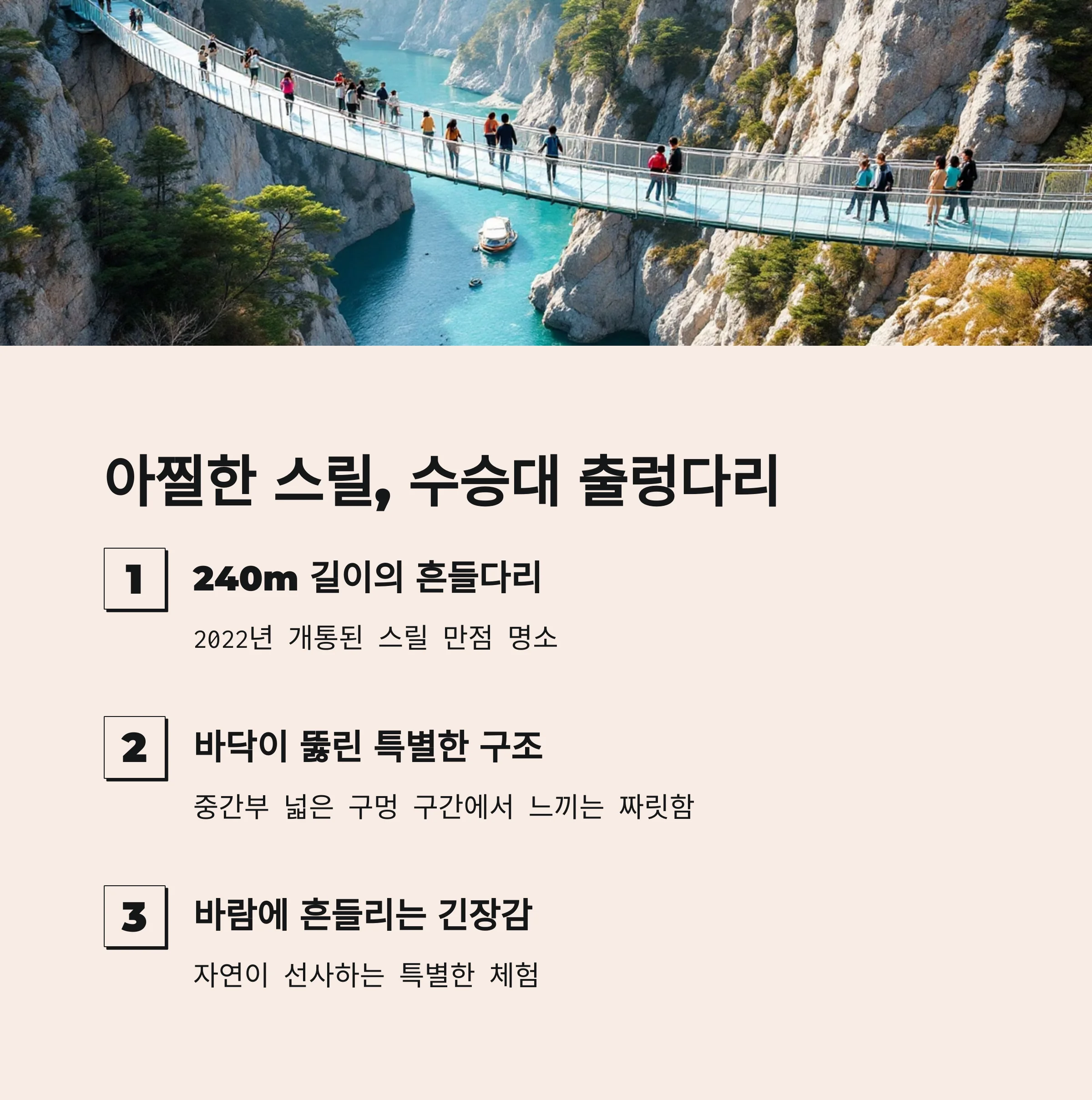 특히 출렁다리 중간부의 넓은 구멍 구간은 스릴의 정점을 찍는 포인트로, 바람에 흔들릴 때의 긴장감은 이곳만의 매력입니다.