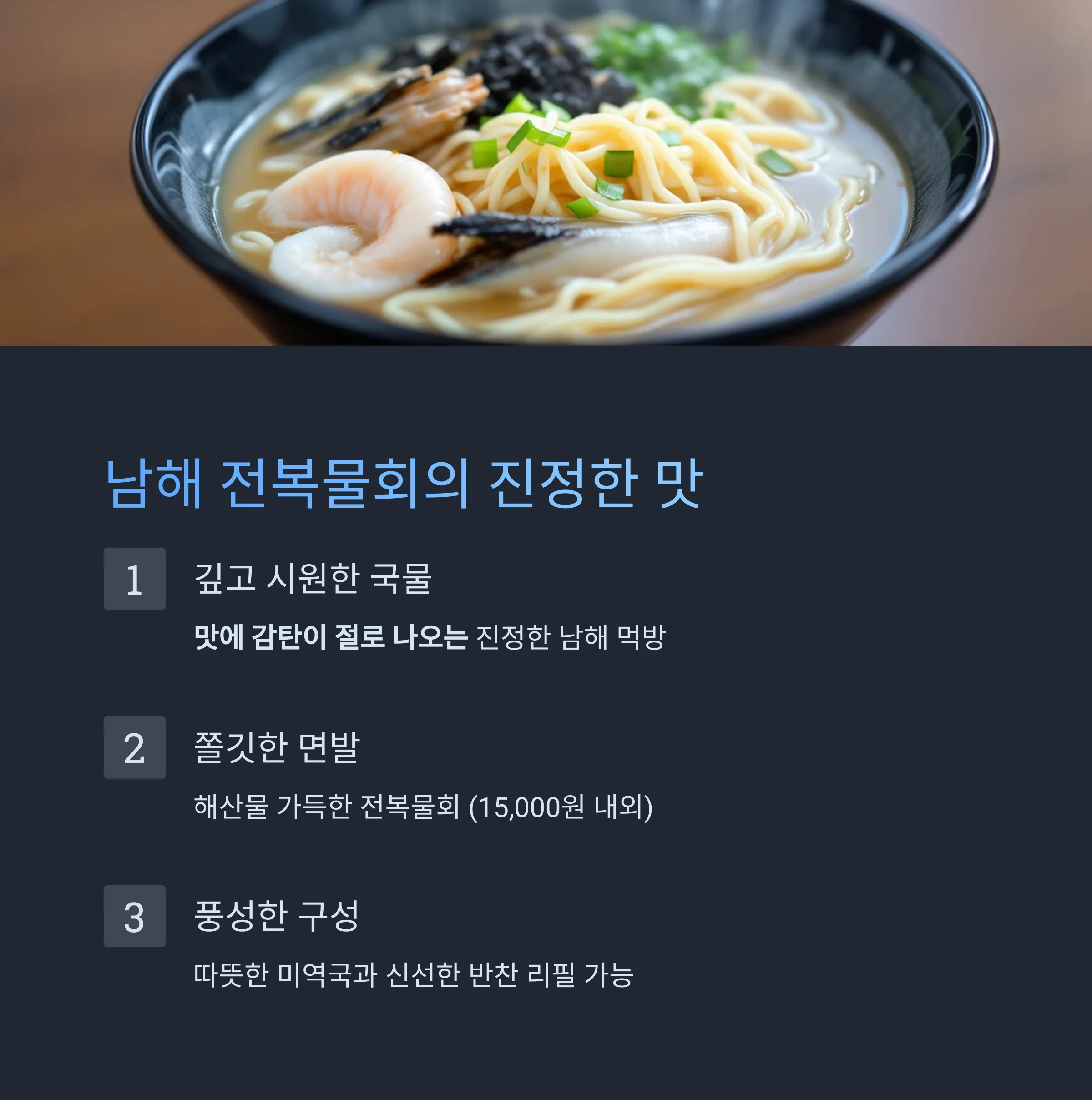 | 전복물회 | 해산물 가득, 면 추가 가능 | 15,000원 내외 |