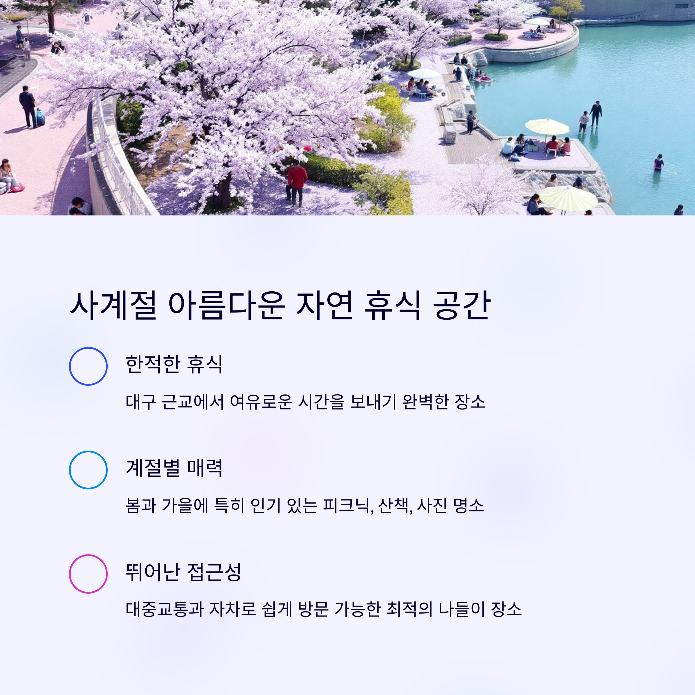 주변에는 벚꽃길과 산책로가 잘 정비돼 있어 자연과 함께하는 휴식 공간으로 손색이 없습니다.