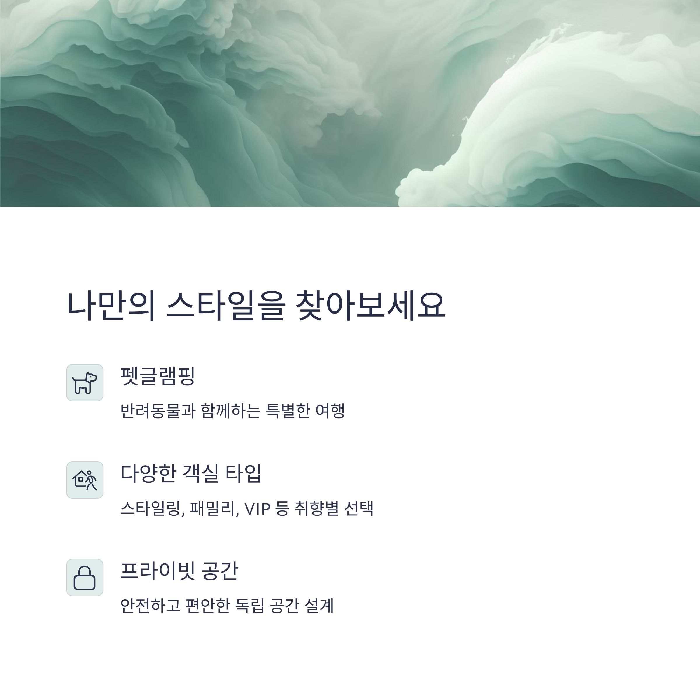 "나만의 스타일에 맞춘 글램핑을 선택해 진정한 여유를 즐겨보세요." 🐾