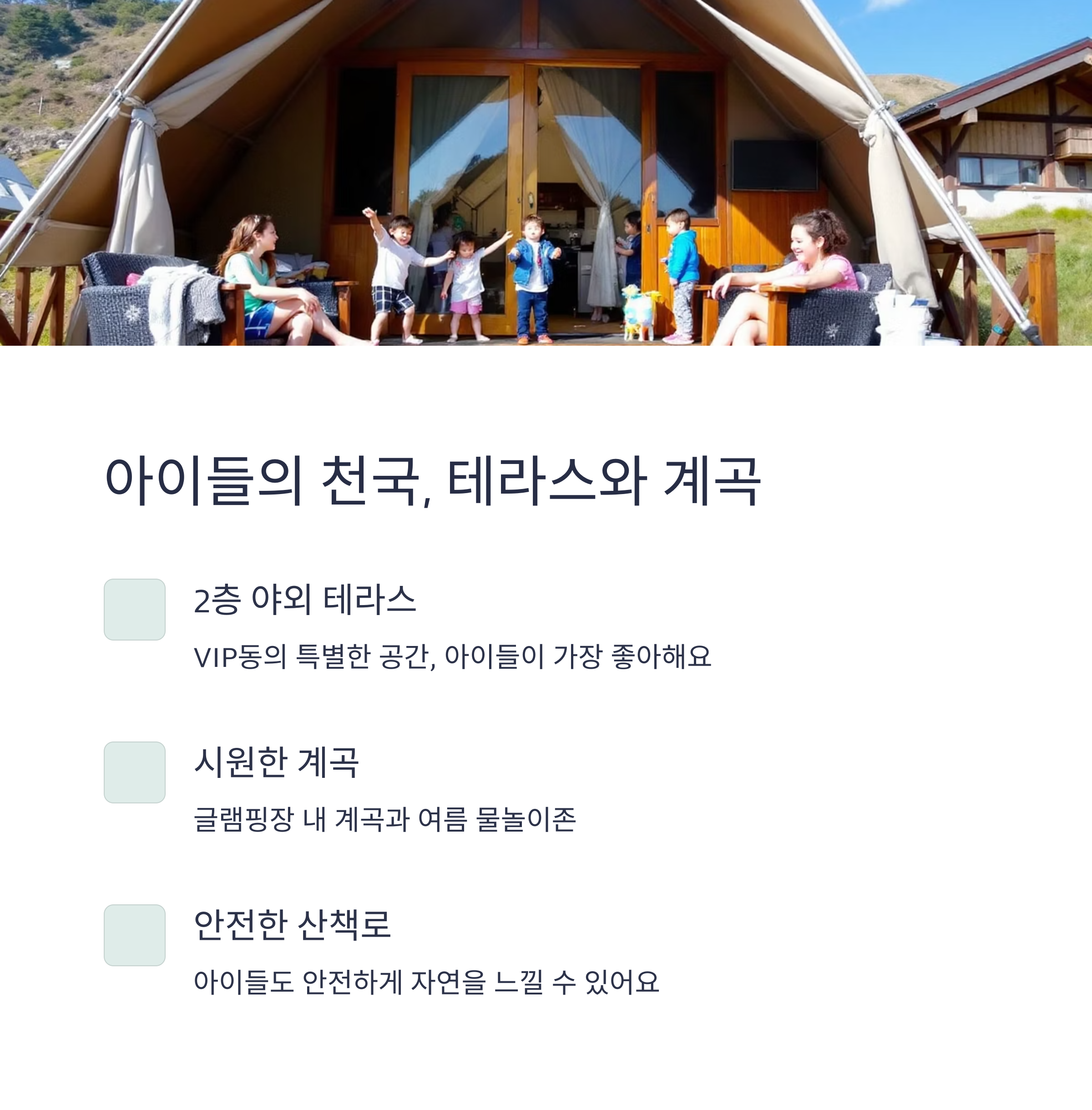 아이들이 마음껏 뛰놀 수 있는 2층 야외 테라스와 계곡 산책로도 준비되어 있습니다.