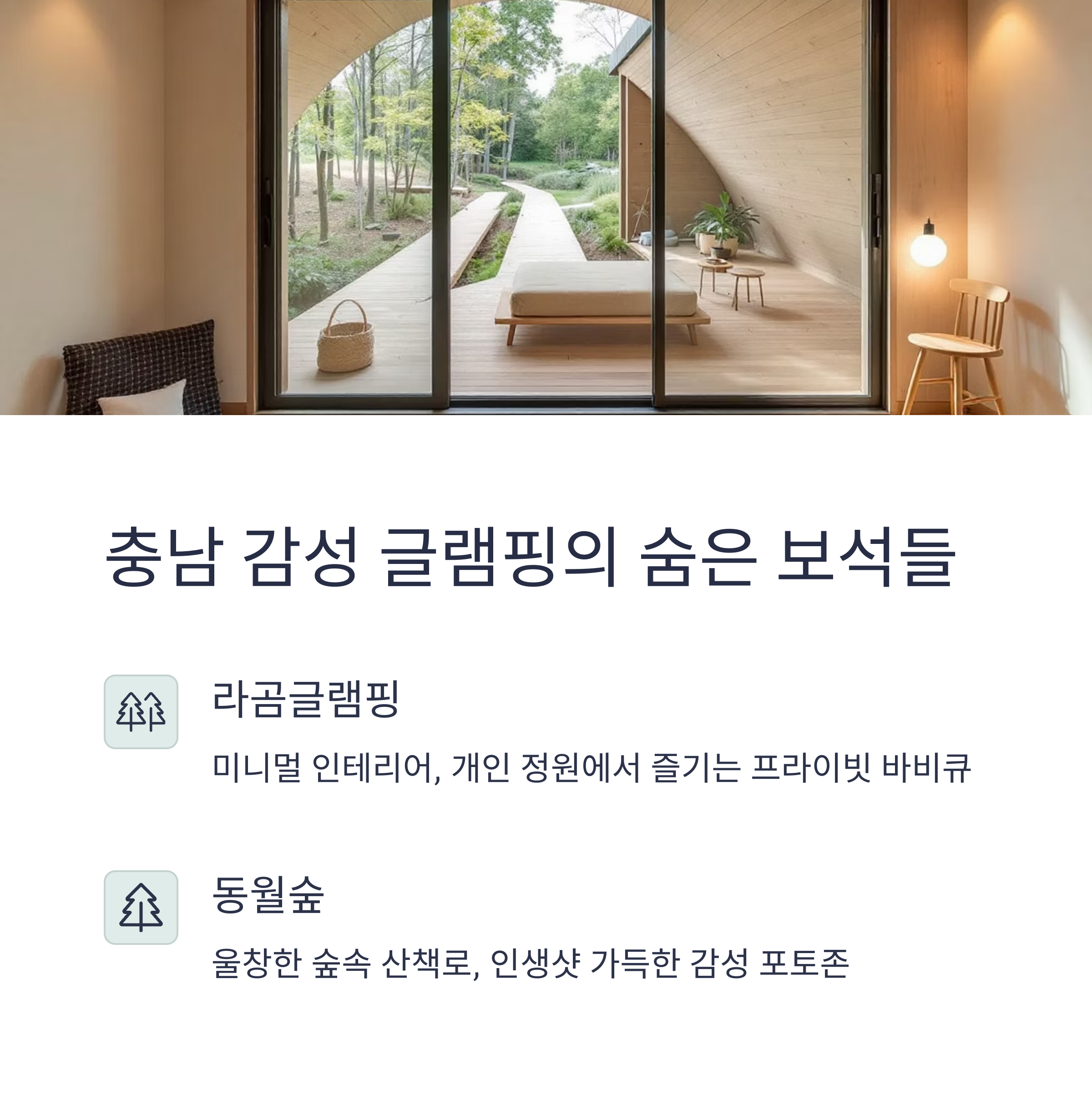 충남 지역에는 라곰글램핑, 동월숲처럼 감성 넘치는 글램핑장이 많습니다.