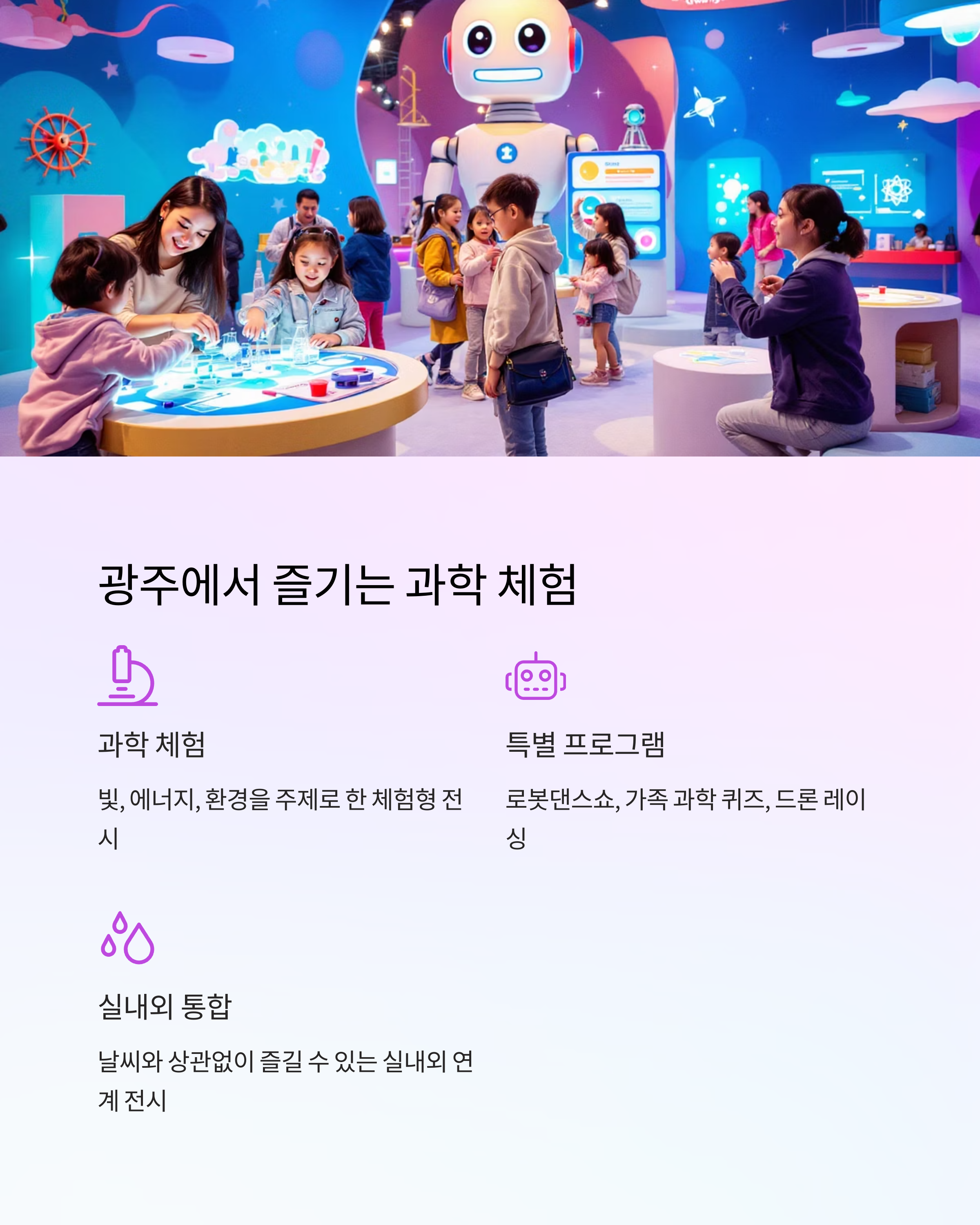 | 광주 | 국립광주과학관 | 과학 체험 전문 | 드론 레이싱, 로봇댄스쇼 |