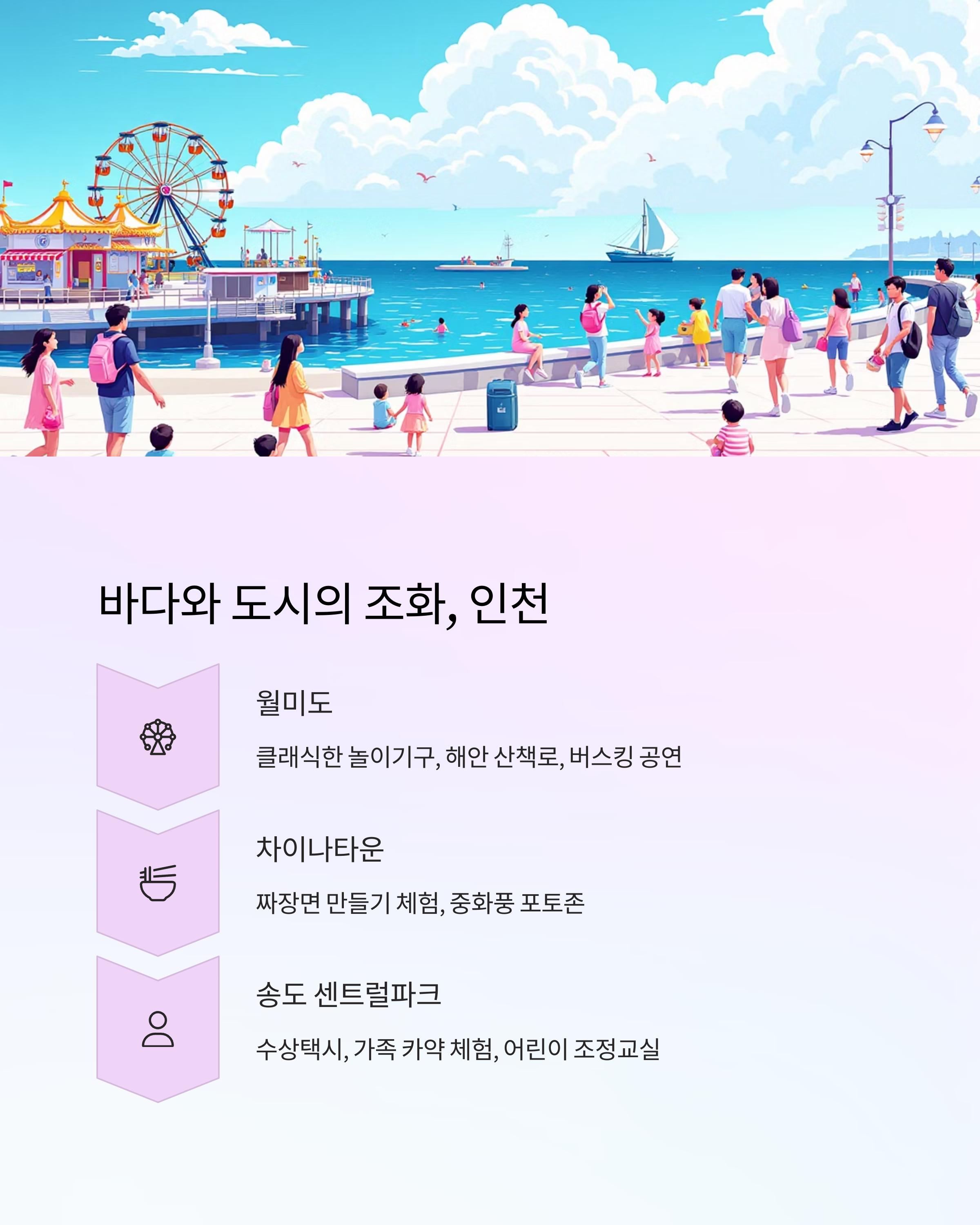 | 인천 | 월미도, 차이나타운 | 놀이기구, 이국적 음식, 거리 공연 | 버스킹, 포토존, 음식 체험 |