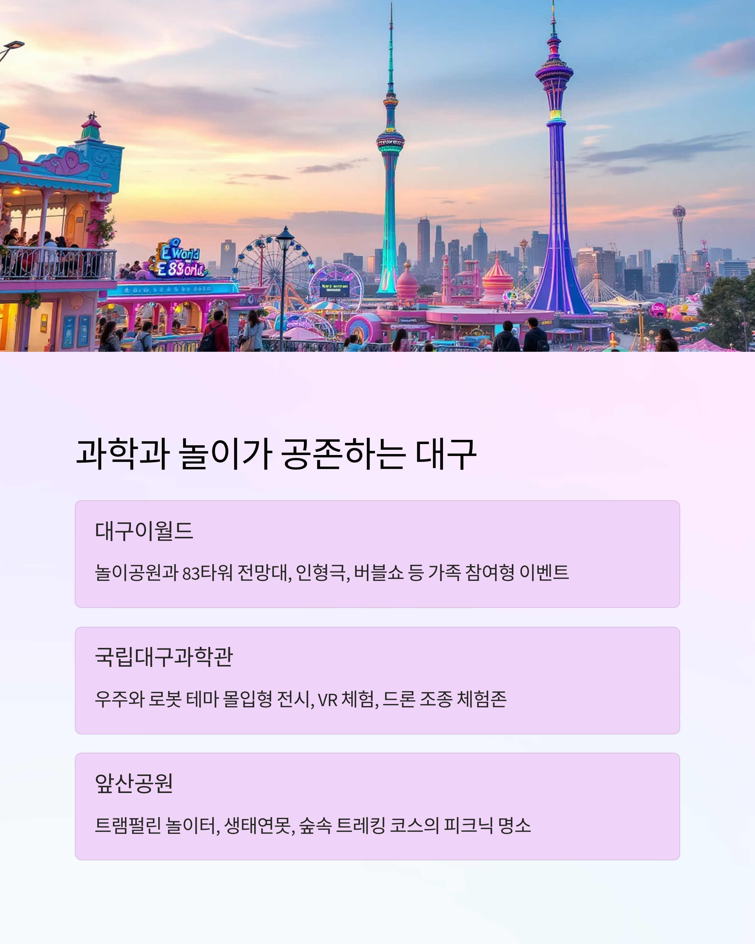 | 대구 | 대구이월드 | 놀이공원 + 전망대 | 할인 이벤트, 버블쇼 |