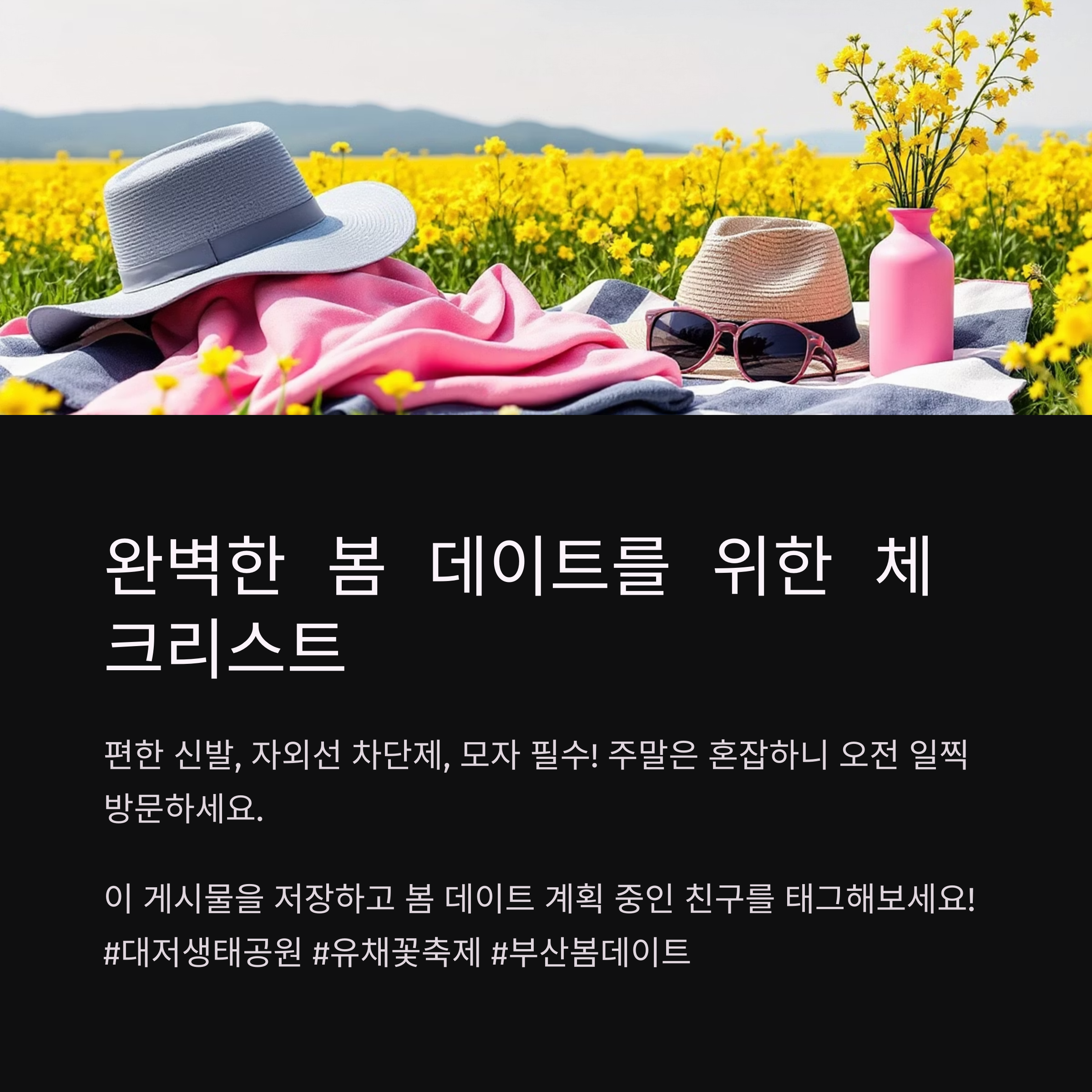 "부산의 봄을 알리는 대저생태공원 유채꽃 축제는 매년 수십만 명이 찾는 대표 봄 명소입니다."