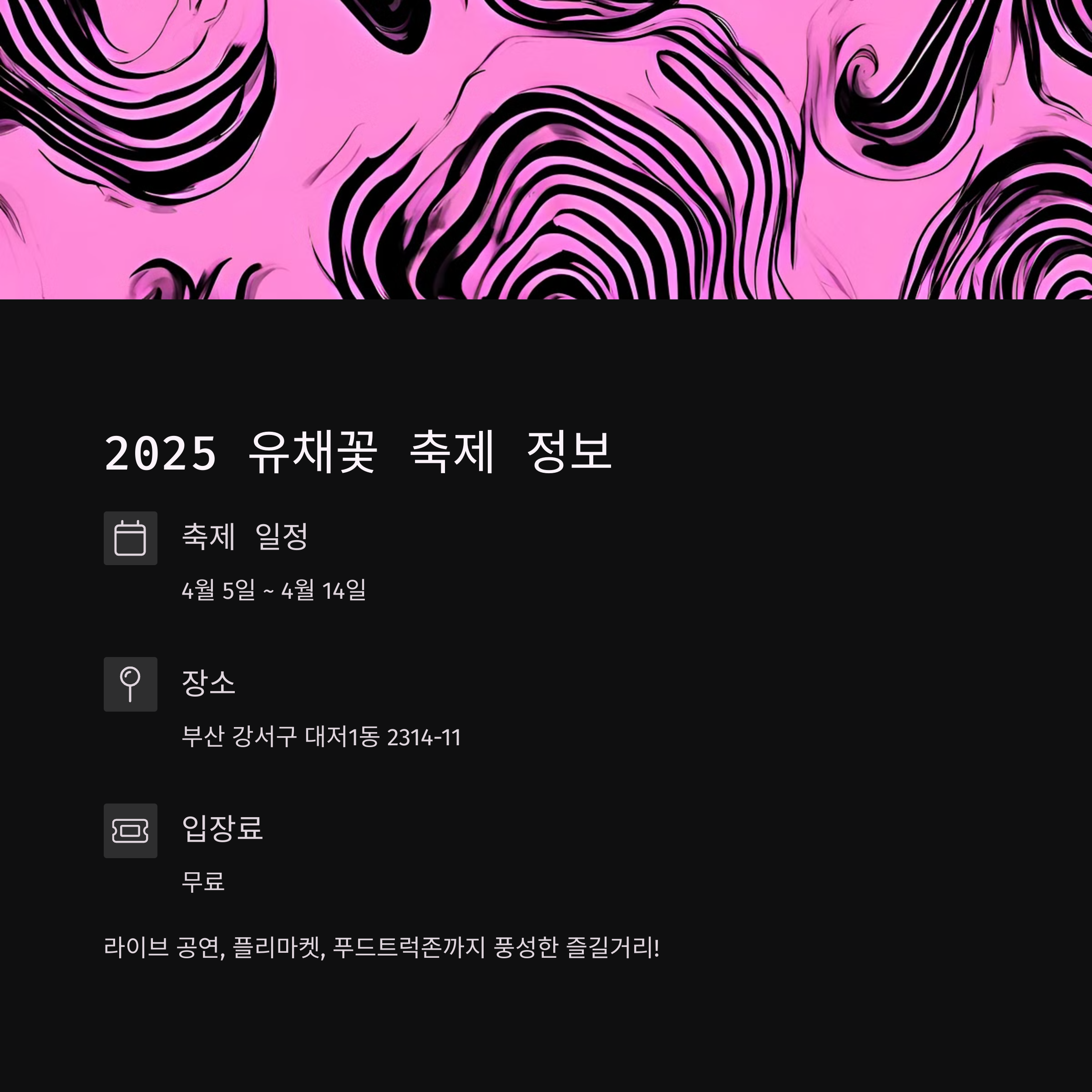 올해는 축제기간 내내 라이브 공연, 지역 농산물 플리마켓, 푸드트럭존까지 풍성하게 마련되어 데이트 코스로도, 가족 나들이 코스로도 손색이 없습니다.