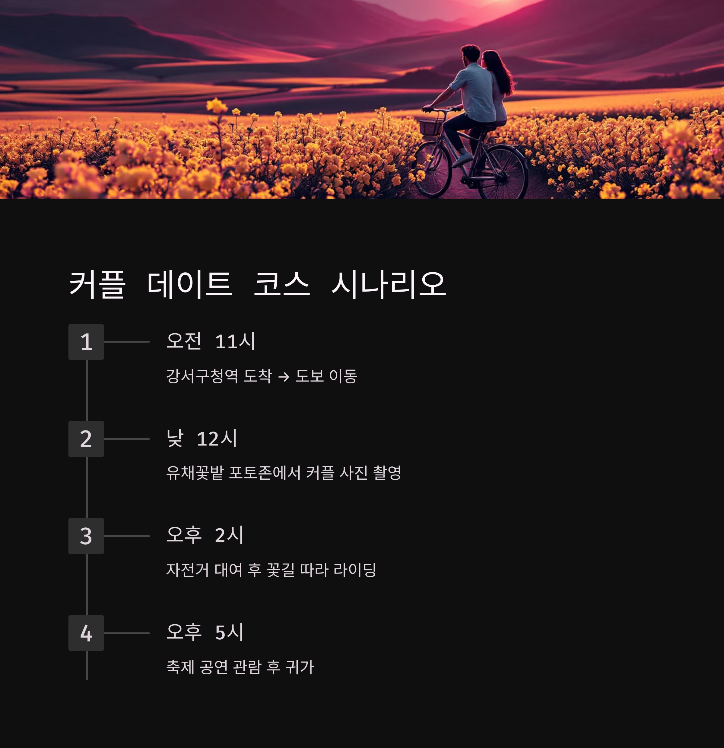 - 낮 12시: 유채꽃밭 포토존에서 커플 사진 촬영