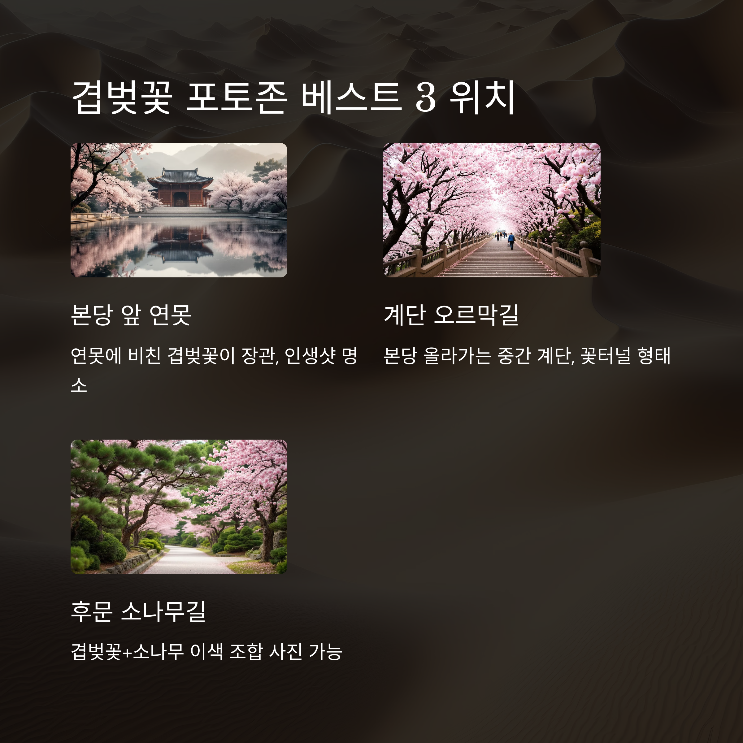 | 후문 소나무길 인근 | 문수사 뒷길 우측 소나무 숲 주변 | 겹벚꽃+소나무 이색 조합 사진 가능 |