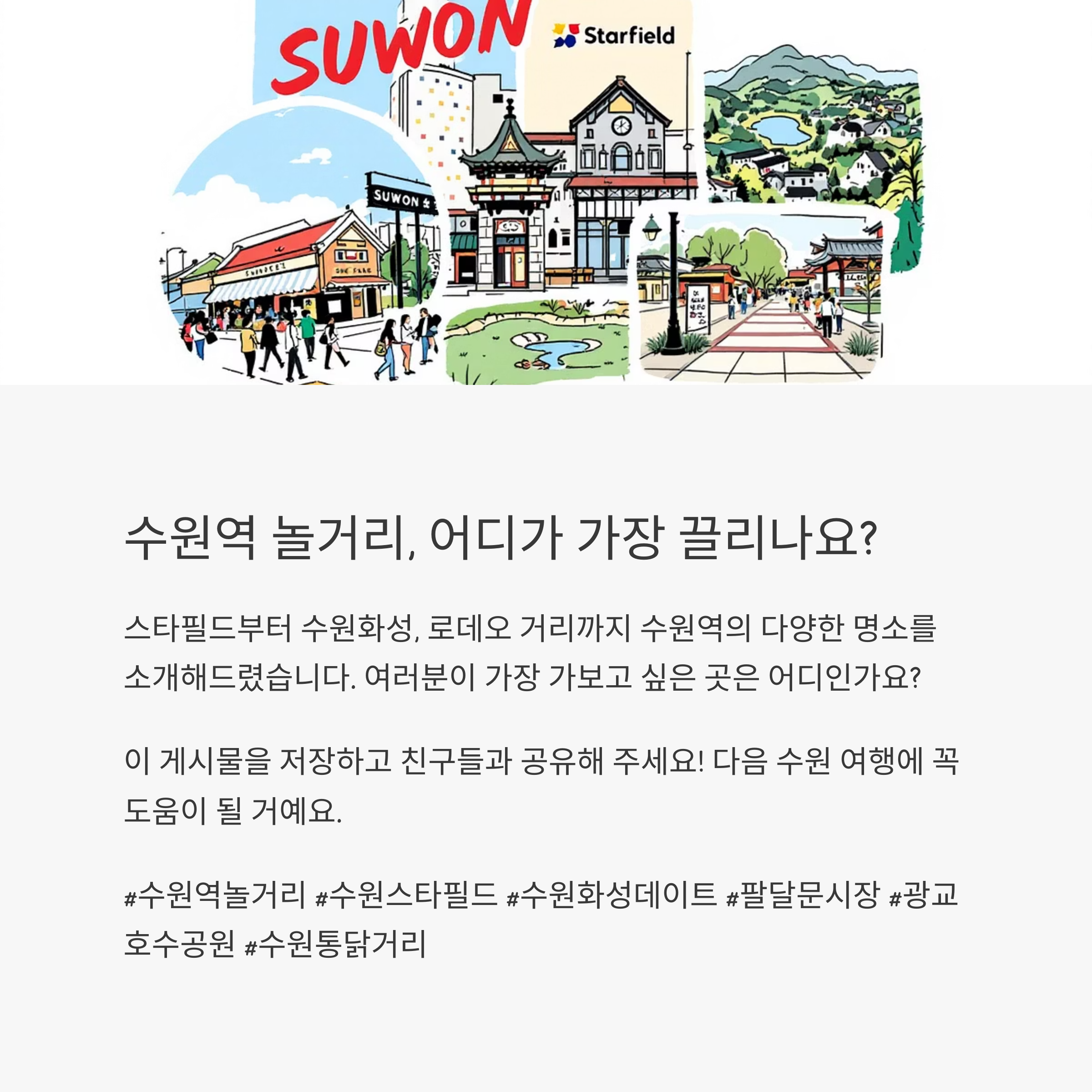 "쇼핑, 맛집, 문화생활까지 한 번에 해결되는 수원의 핵심 명소!"
