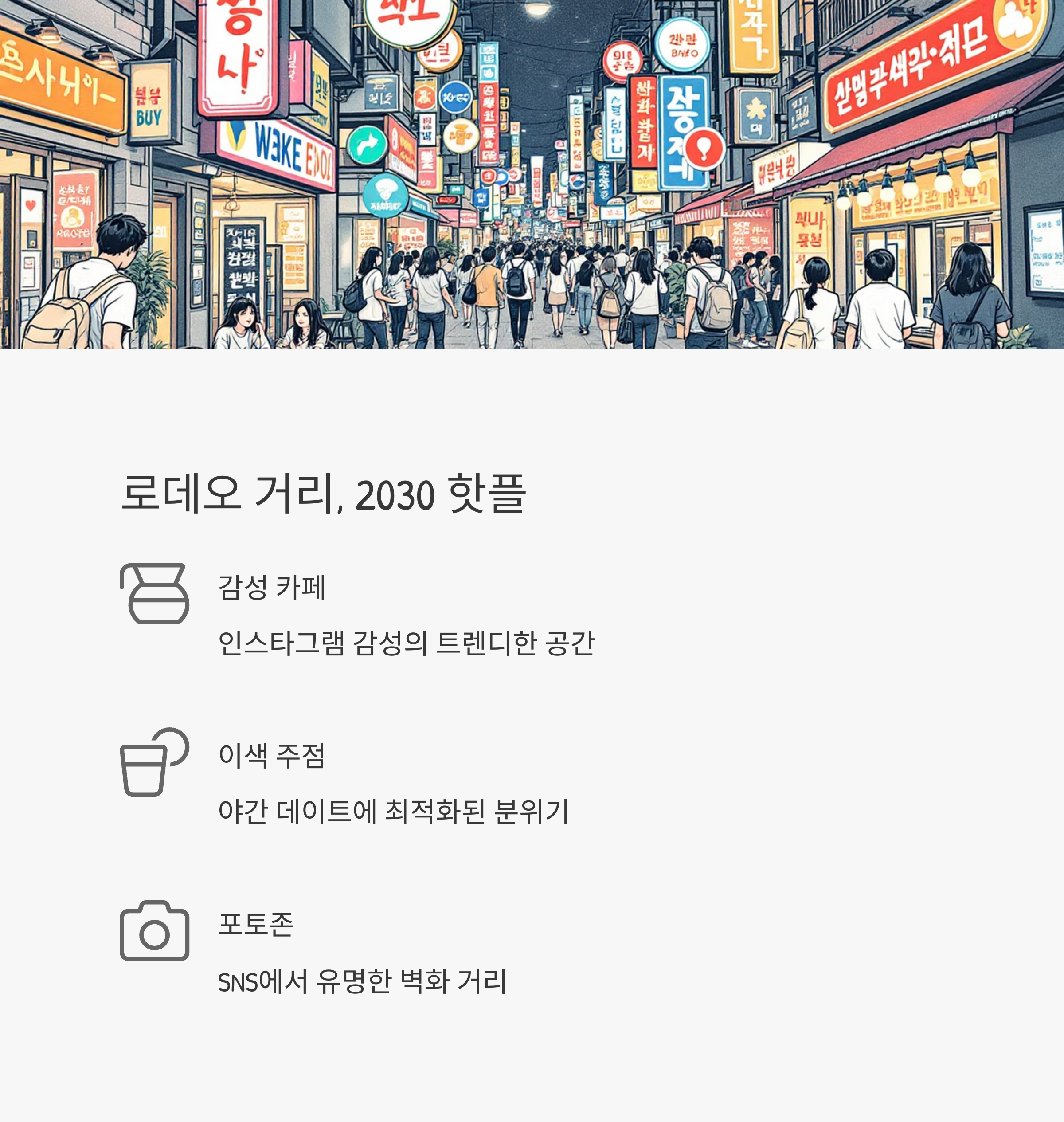 특히 SNS에서 유명한 포토존 벽화 거리와 스트리트 패션 숍이 많아