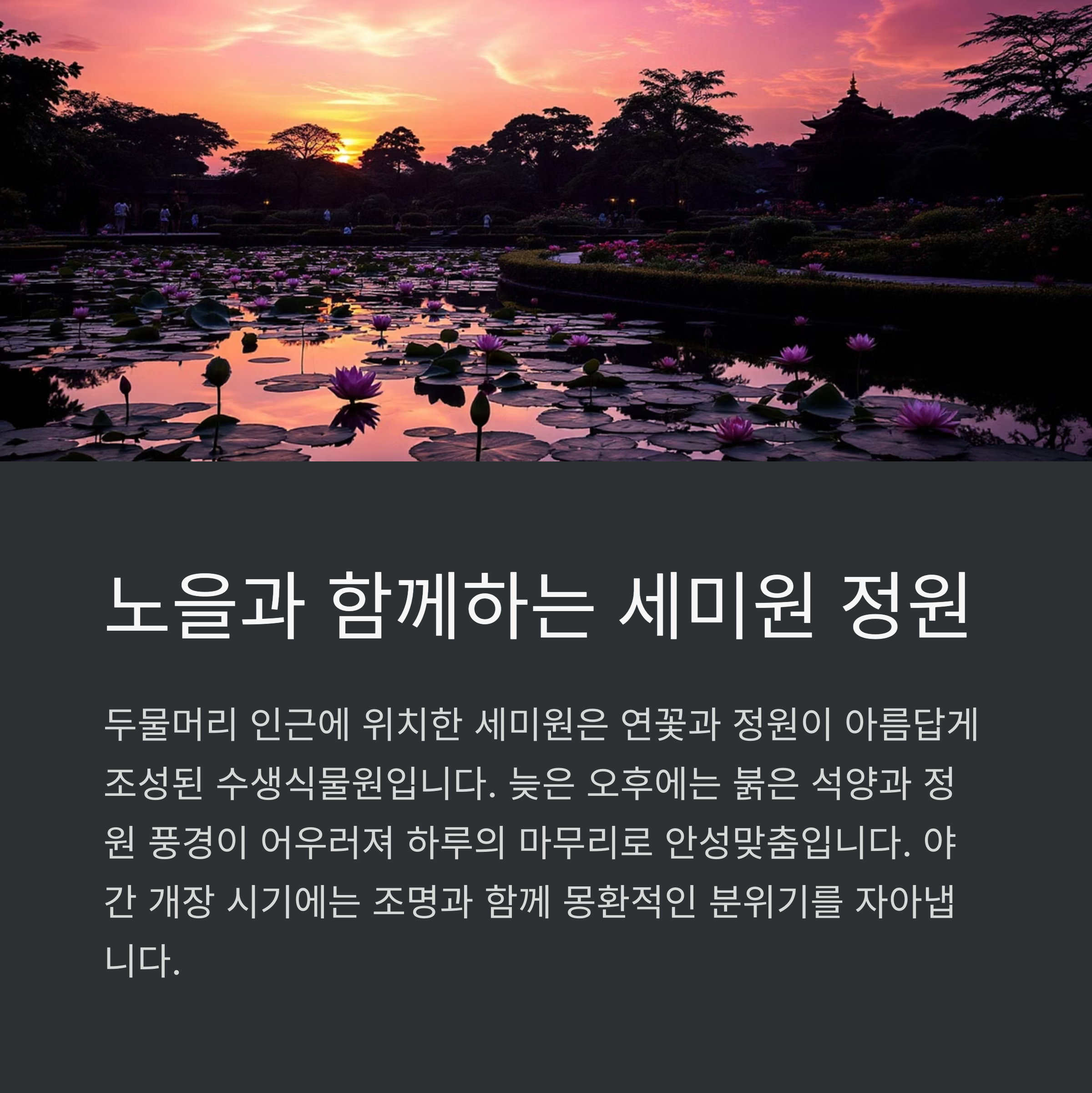 저녁 노을 감상 명소: 세미원 정원