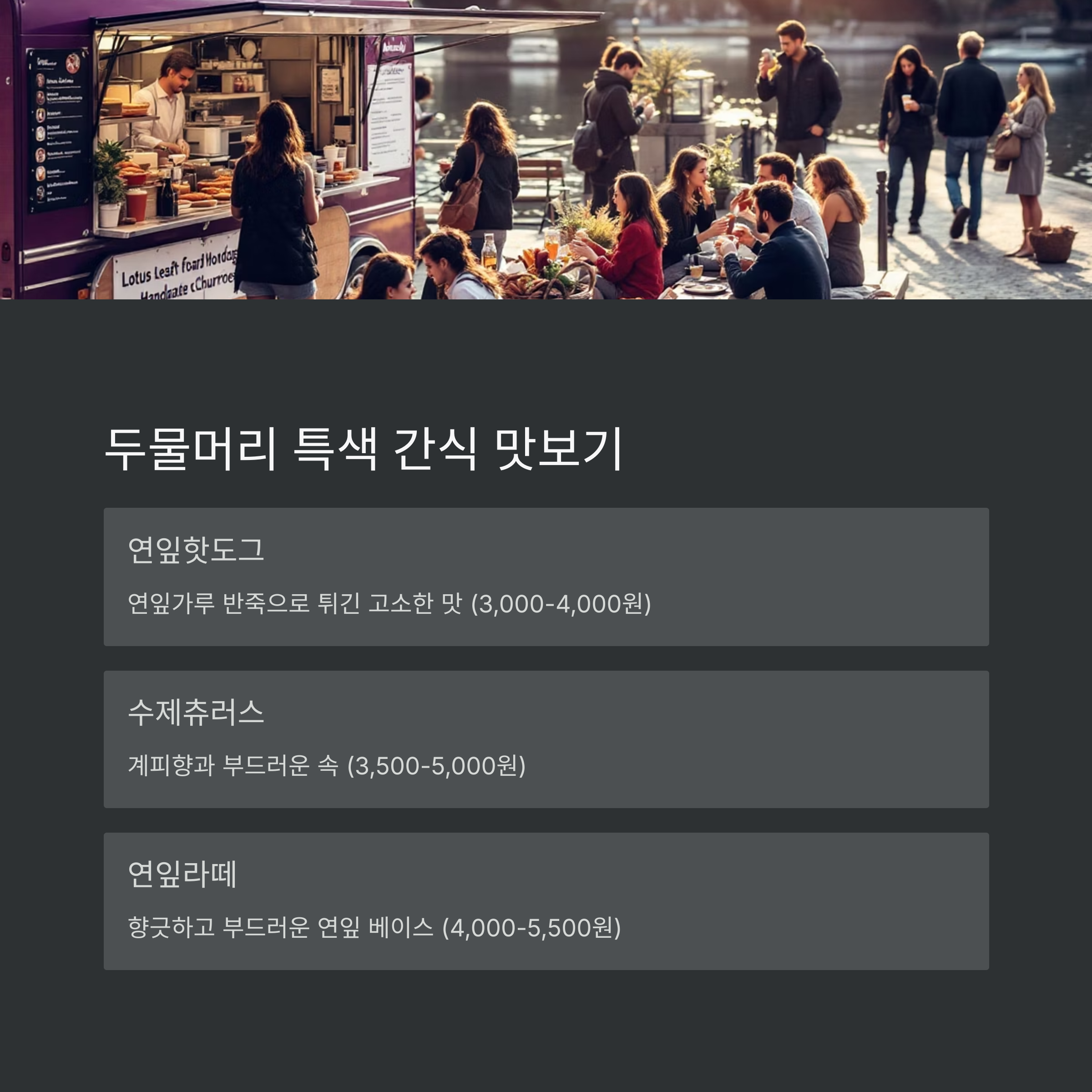| 연잎핫도그 | 연잎가루 반죽으로 튀긴 고소한 맛 | 3,000~4,000원 |