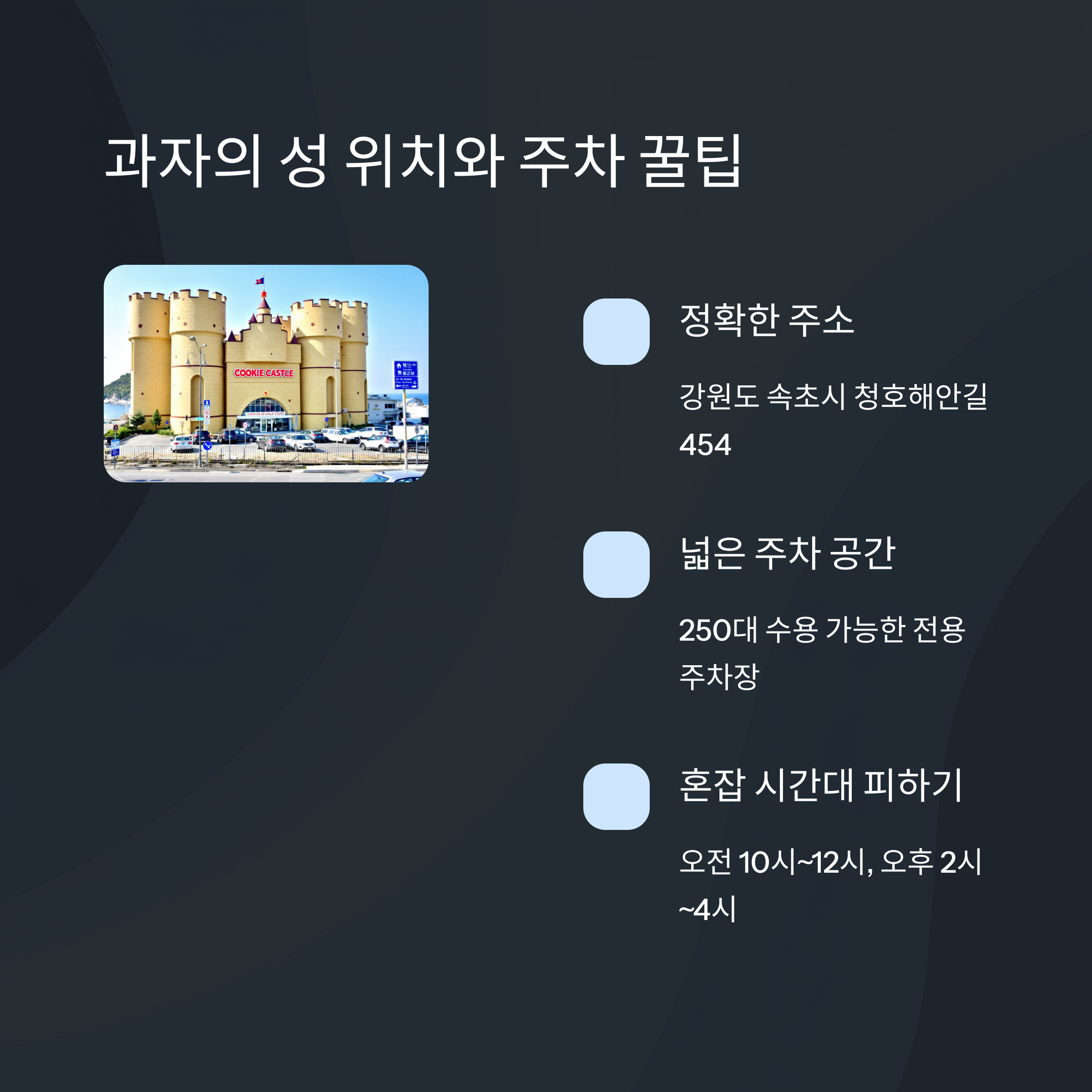 과자의 성은 속초시 미시령로 3010, 속초 IC에서 진입하자마자 접근 가능한 곳에 위치해 있습니다