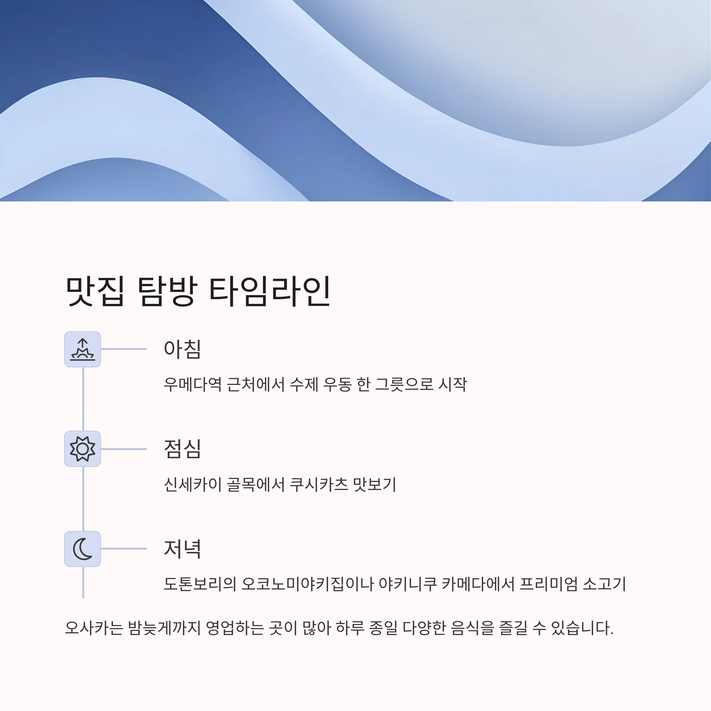 아침에는 우메다역 근처에서 수제 우동 한 그릇으로 여행을 시작하고, 점심에는 신세카이 골목에서 쿠시카츠를 맛본 후, 저녁에는 도톤보리의 오코노미야키집이나 야키니쿠 카메다에서 프리미엄 소고기를 즐기는 일정이 인기입니다.