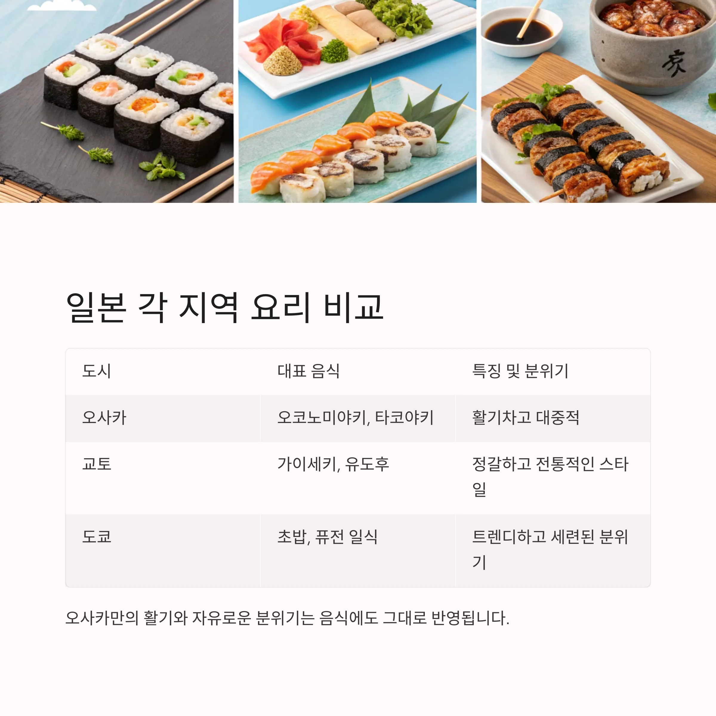 | 오사카 | 오코노미야키, 타코야키 | 활기차고 대중적 |