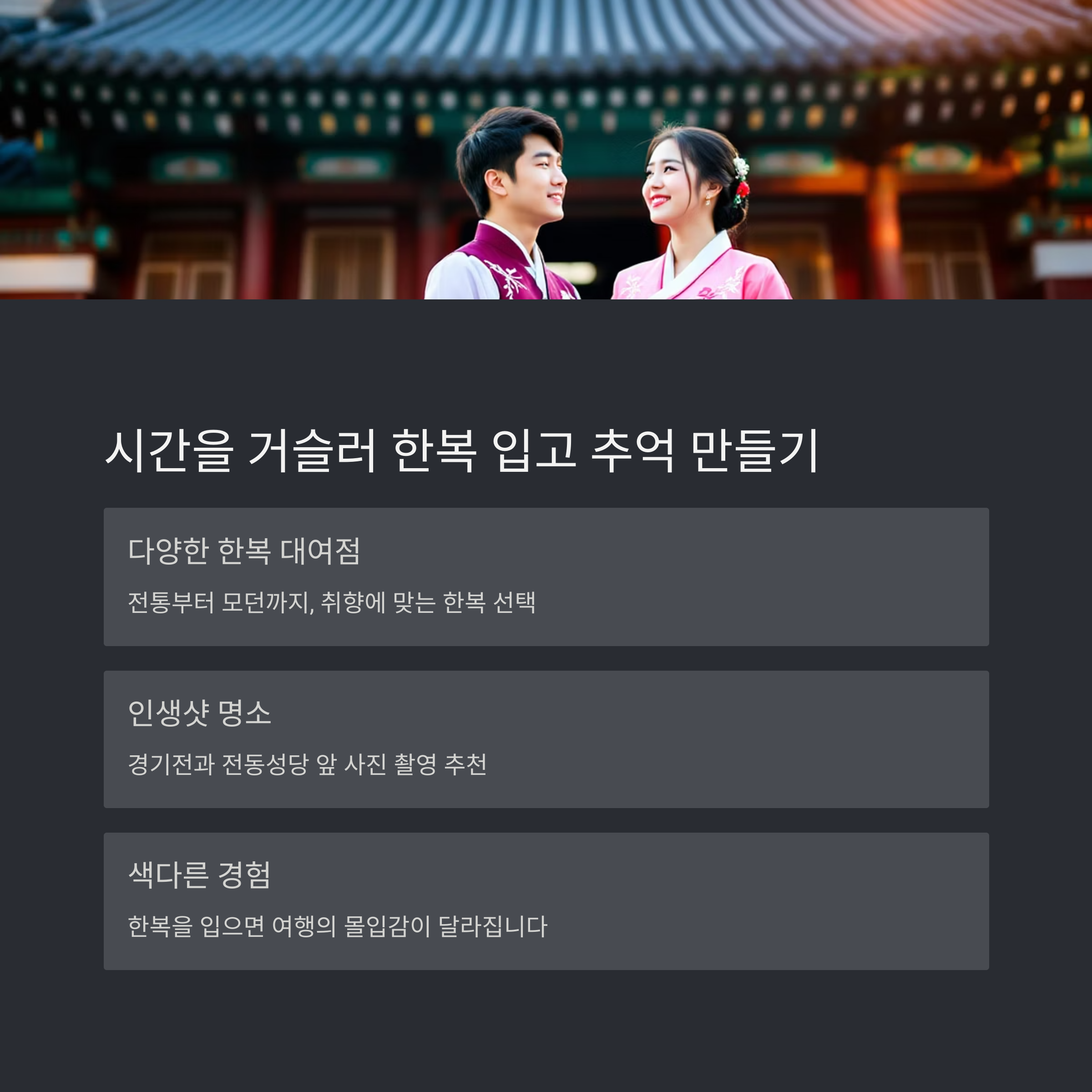 한복을 입고 사진을 찍으면 감성 가득한 추억을 남길 수 있습니다. 📸