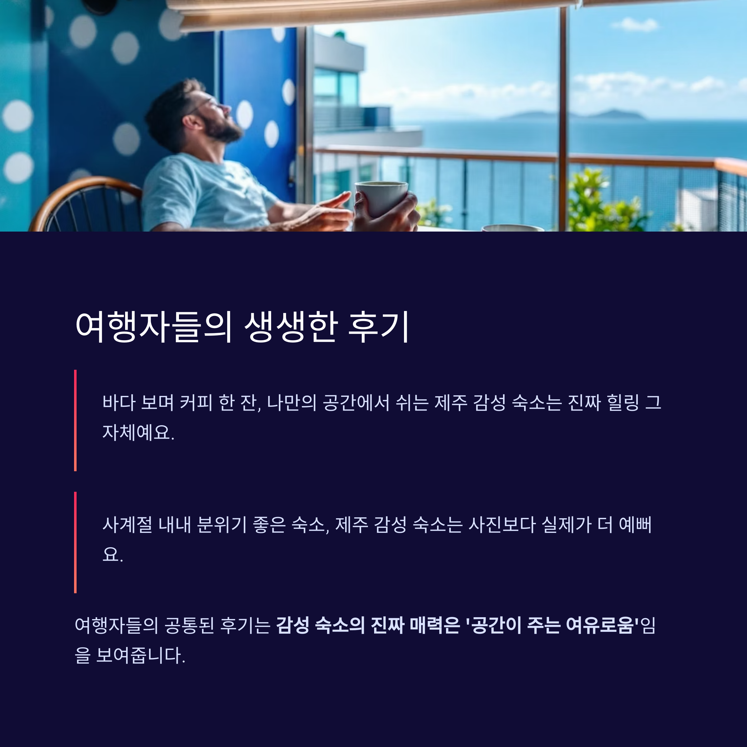 이처럼 여행자들의 공통된 후기는 **감성 숙소의 진짜 매력은 '공간이 주는 여유로움'**임을 보여줍니다.