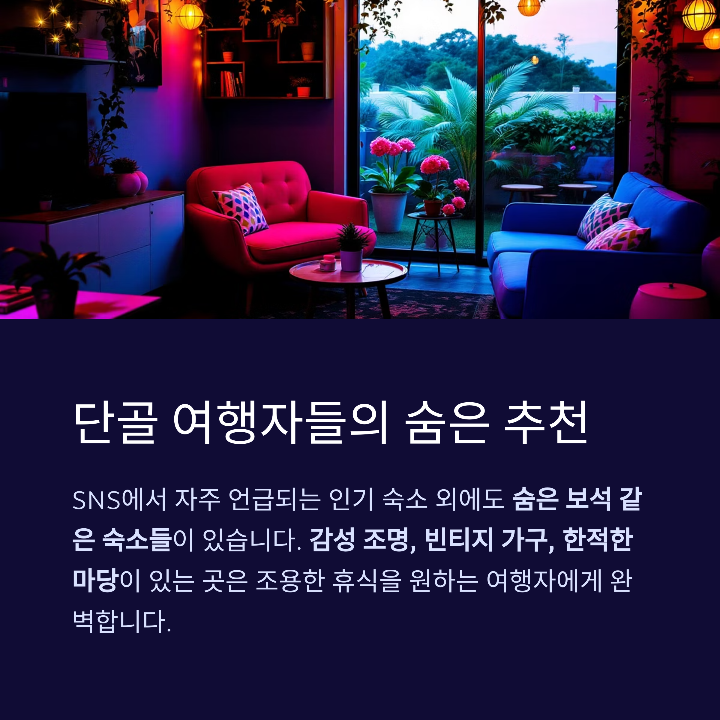 감성 조명, 빈티지 가구, 한적한 마당이 있는 숙소는 특히 감성 여행자에게 추천됩니다.