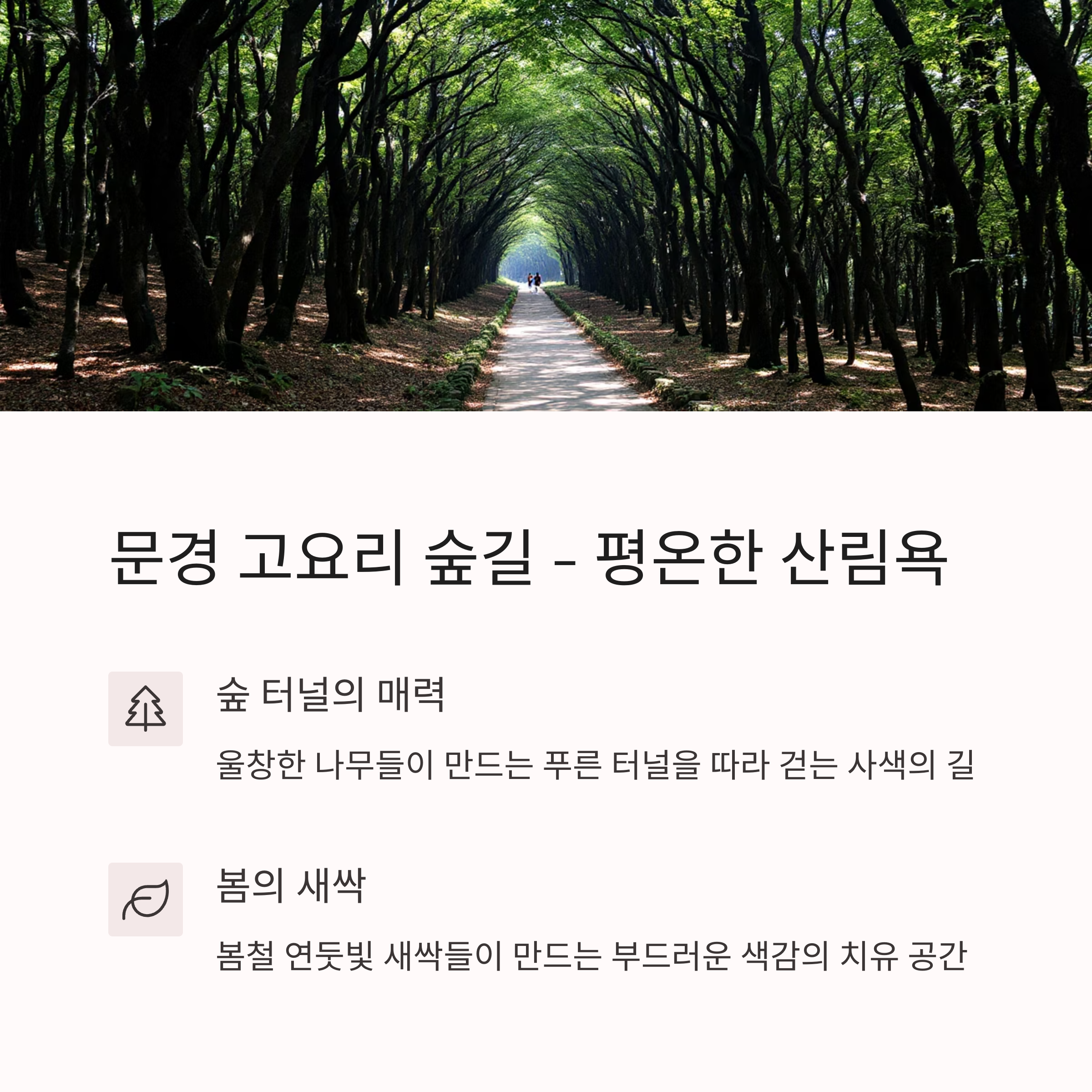 조용한 숲길을 따라 산책하거나 나무 향을 맡으며 쉬어가는 것만으로도 충분한 치유가 됩니다.
