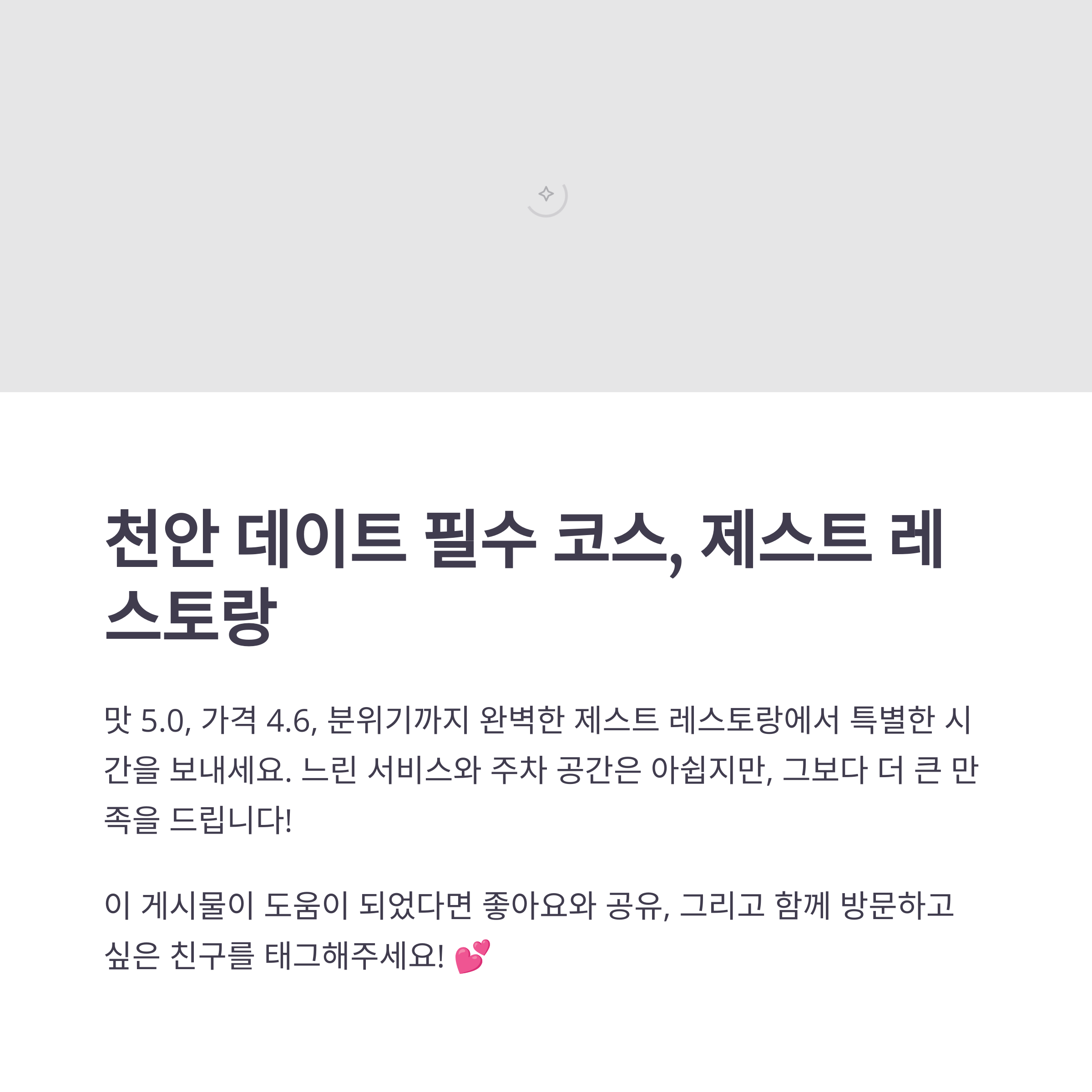 데이트 코스 계획 중이라면 제스트를 중심으로 매력적인 하루를 설계해보세요. 합리적인 가격, 최상의 맛, 그리고 로맨틱한 분위기가 여러분의 하루를 특별하게 만들어줄 것입니다.