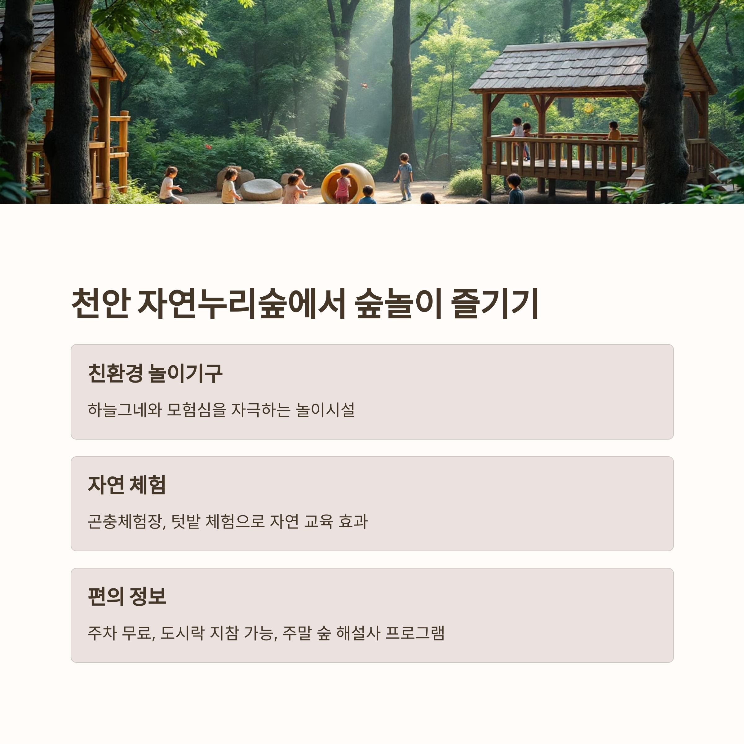 천안 자연누리숲은 아동 친화 도시 천안의 자랑입니다.