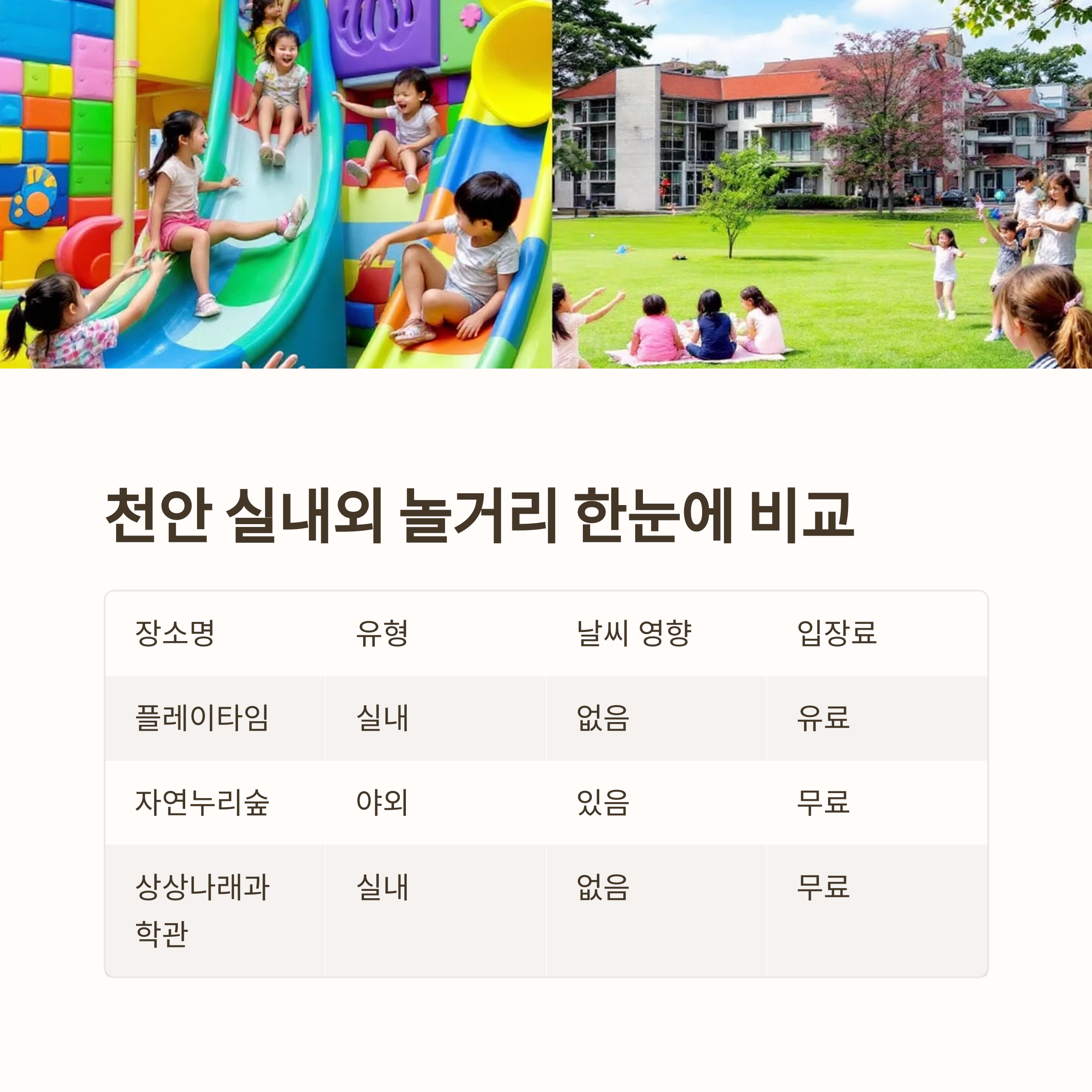 천안 실내외 놀거리 한눈에 비교