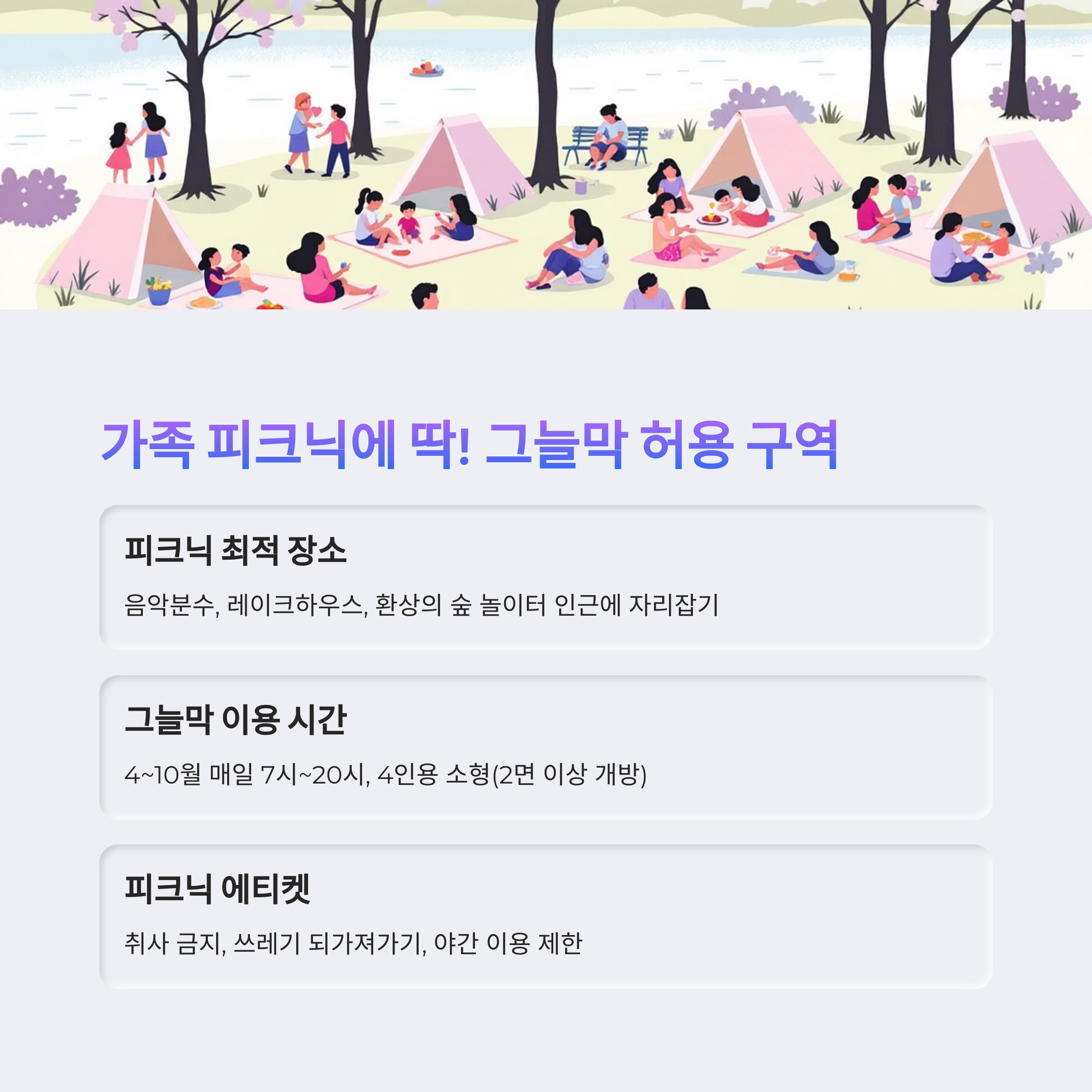 피크닉존과 그늘막 허용 구역 - 가족 피크닉 최적지