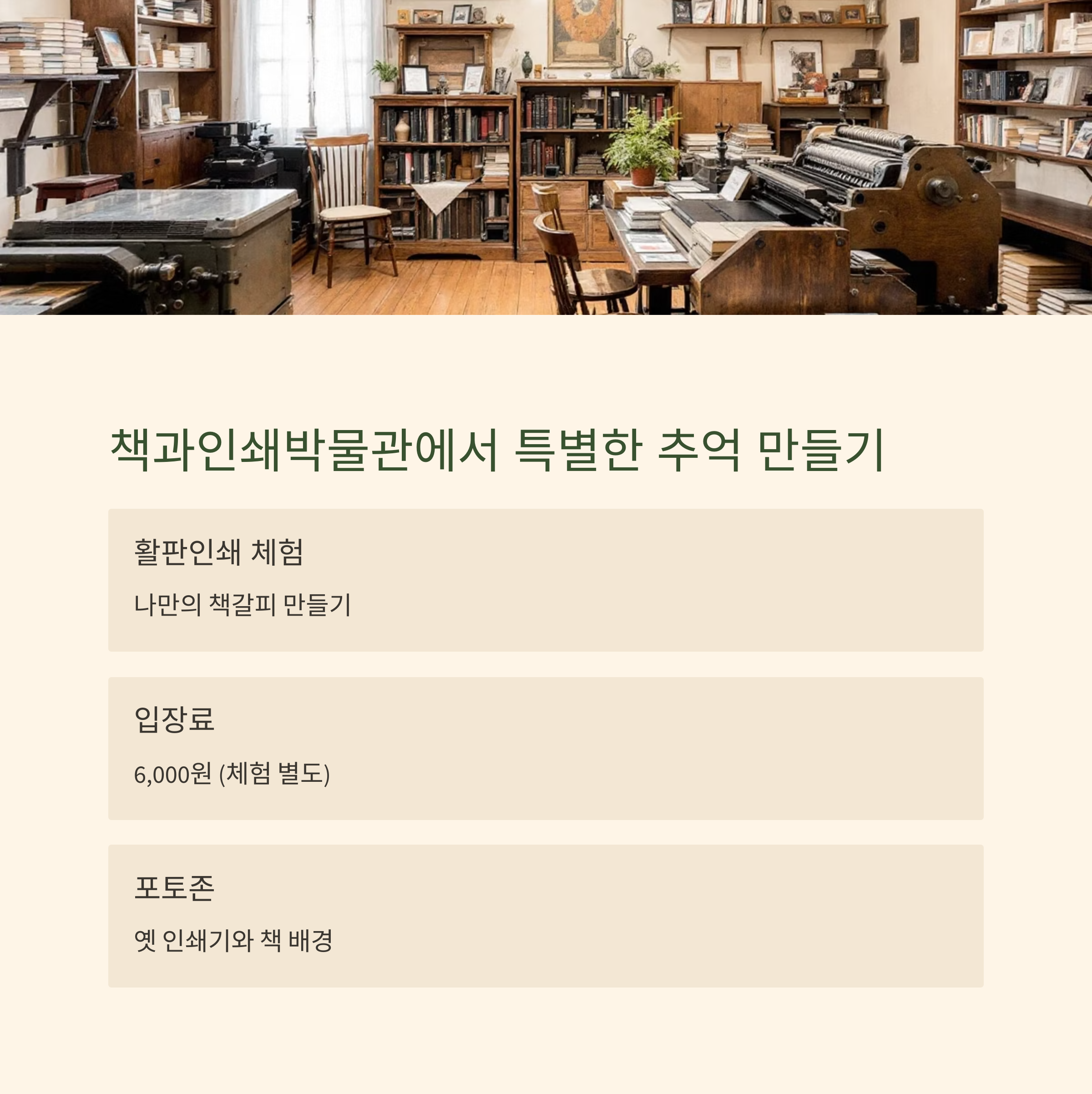 • 포토존: 옛 인쇄기와 책이 가득한 공간에서 인생샷 가능!