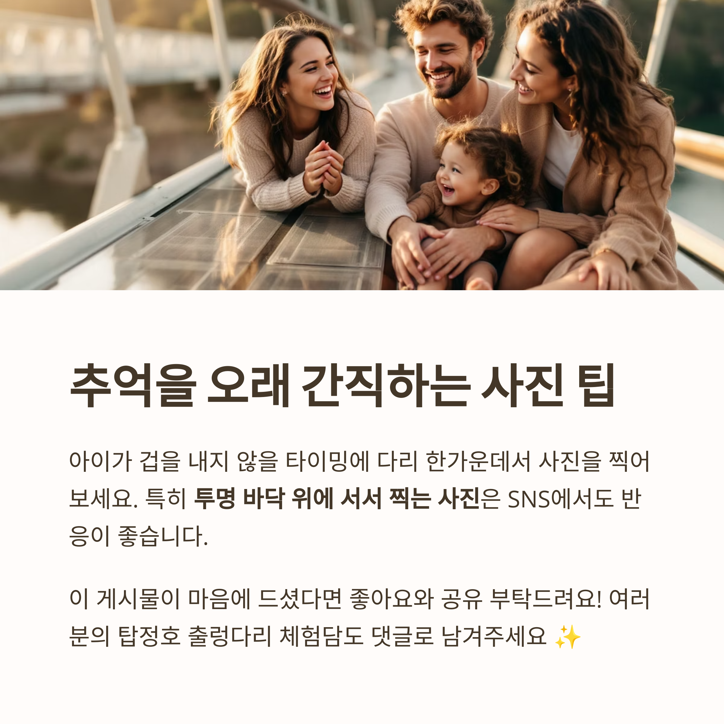 짧은 시간이지만, 함께 걷고, 사진 찍고, 이야기를 나누는 동안 가족 간의 유대도 깊어집니다.