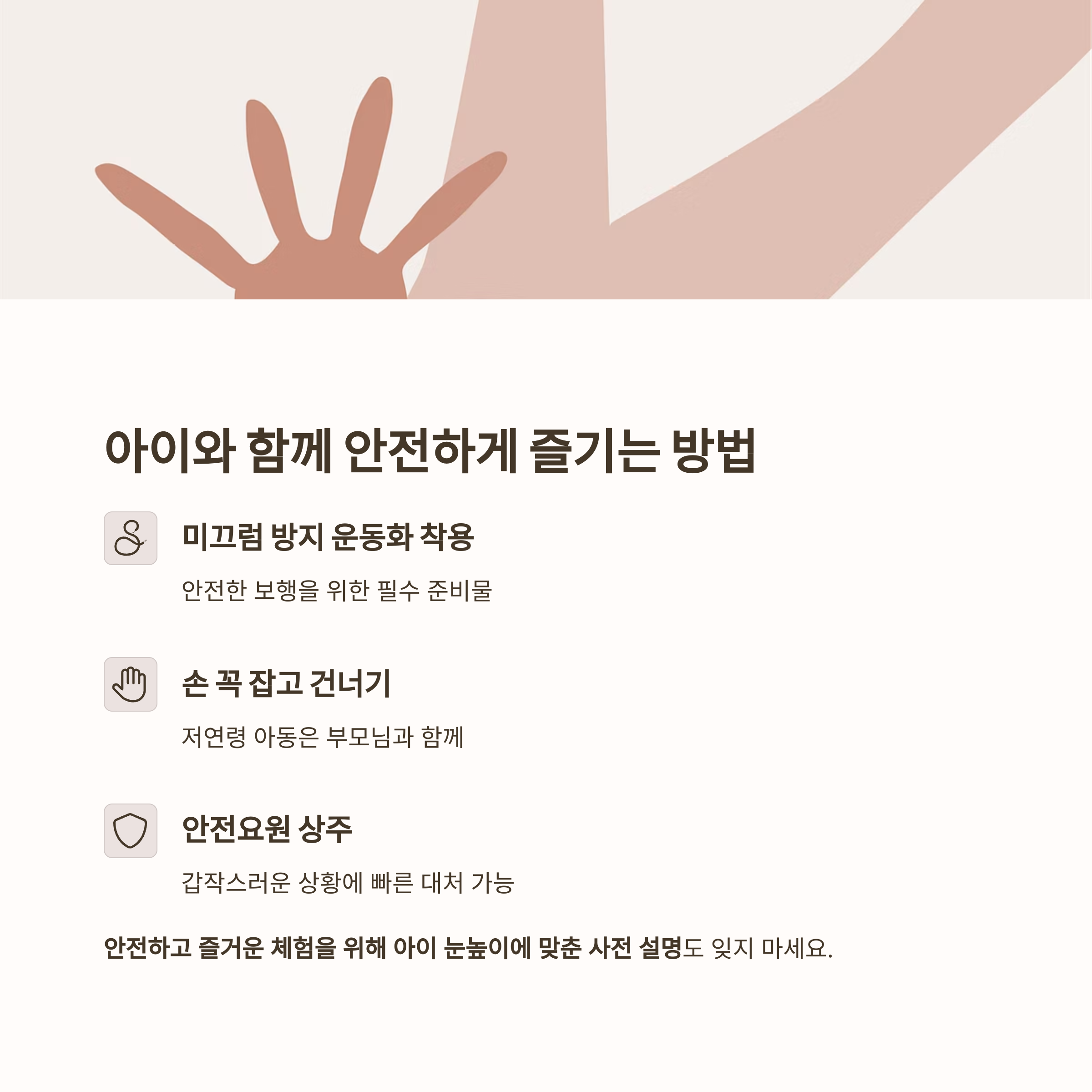 안전하고 즐거운 체험을 위해 아이 눈높이에 맞춘 사전 설명도 잊지 마세요.