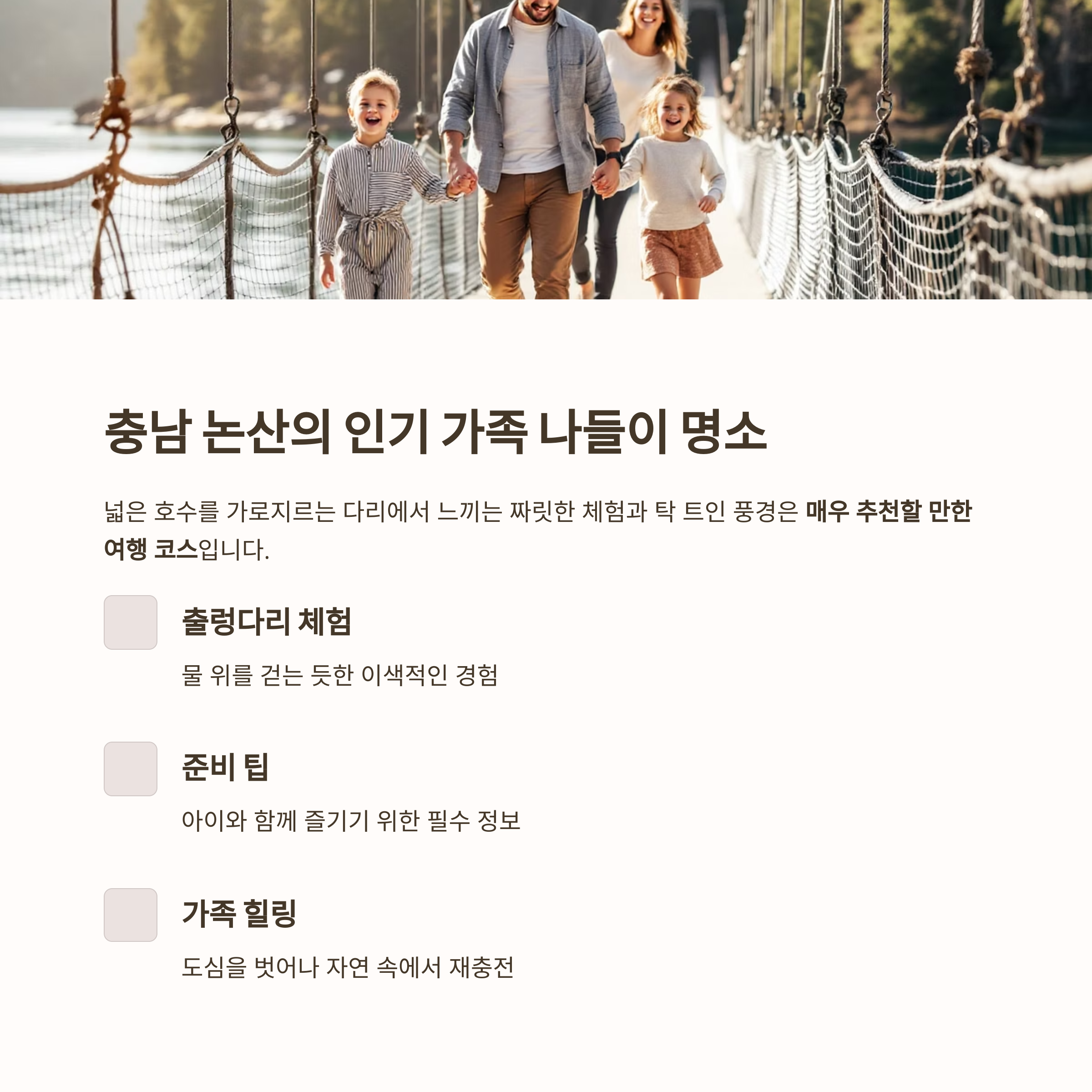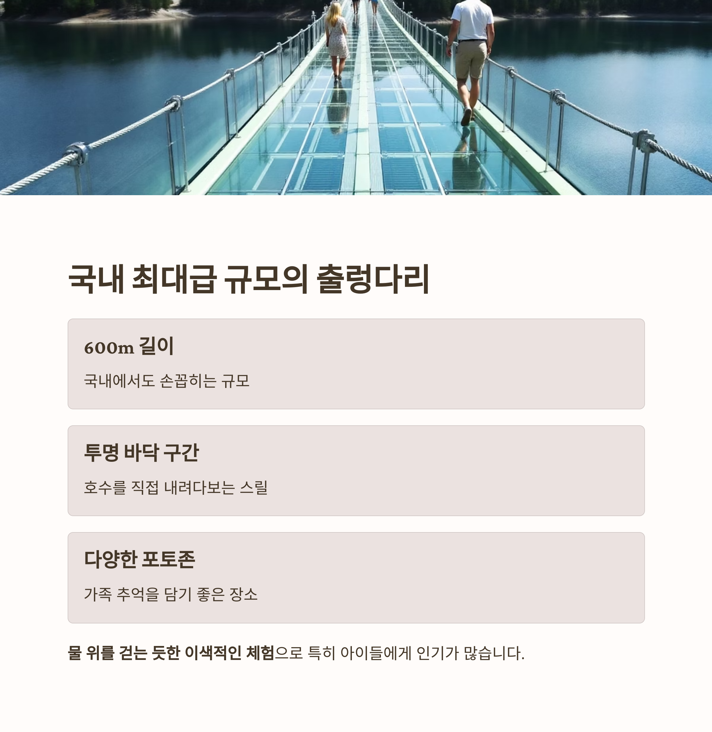 이번 글에서는 출렁다리 체험의 매력과 준비 팁, 아이와 즐길 수 있는 포인트를 중심으로 안내해 드리겠습니다.