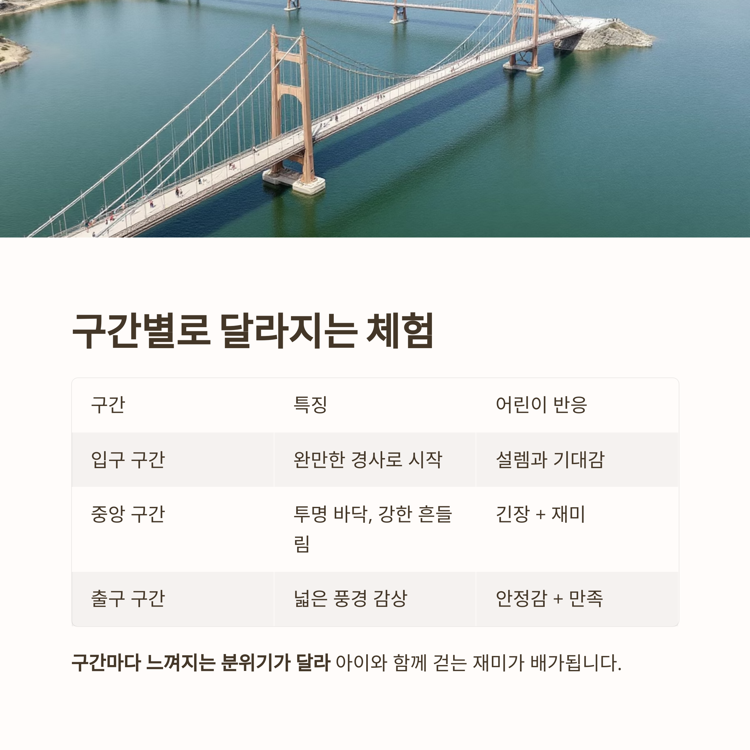 특히 아이들은 다리의 흔들림과 스릴감을 매우 흥미로워합니다.