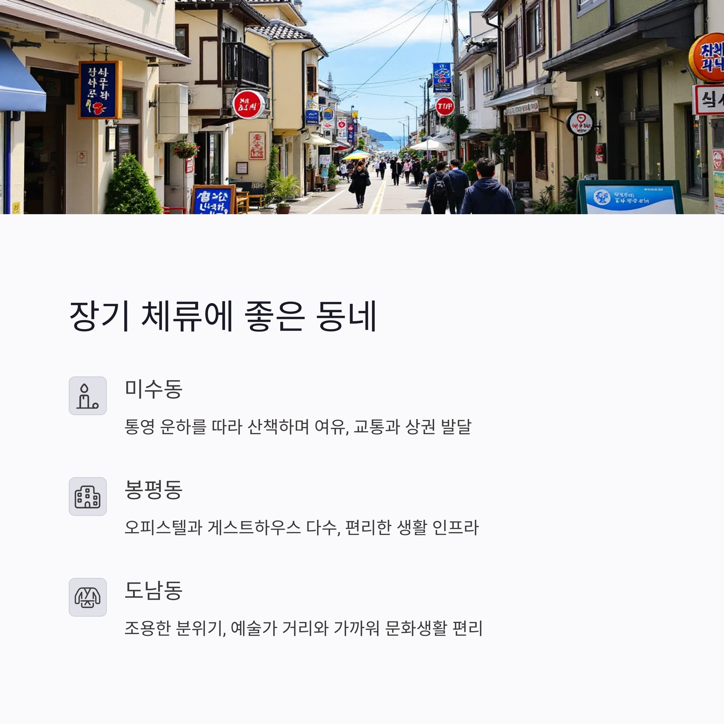 장기 체류에 좋은 동네 - 미수동, 봉평동, 도남동의 매력
