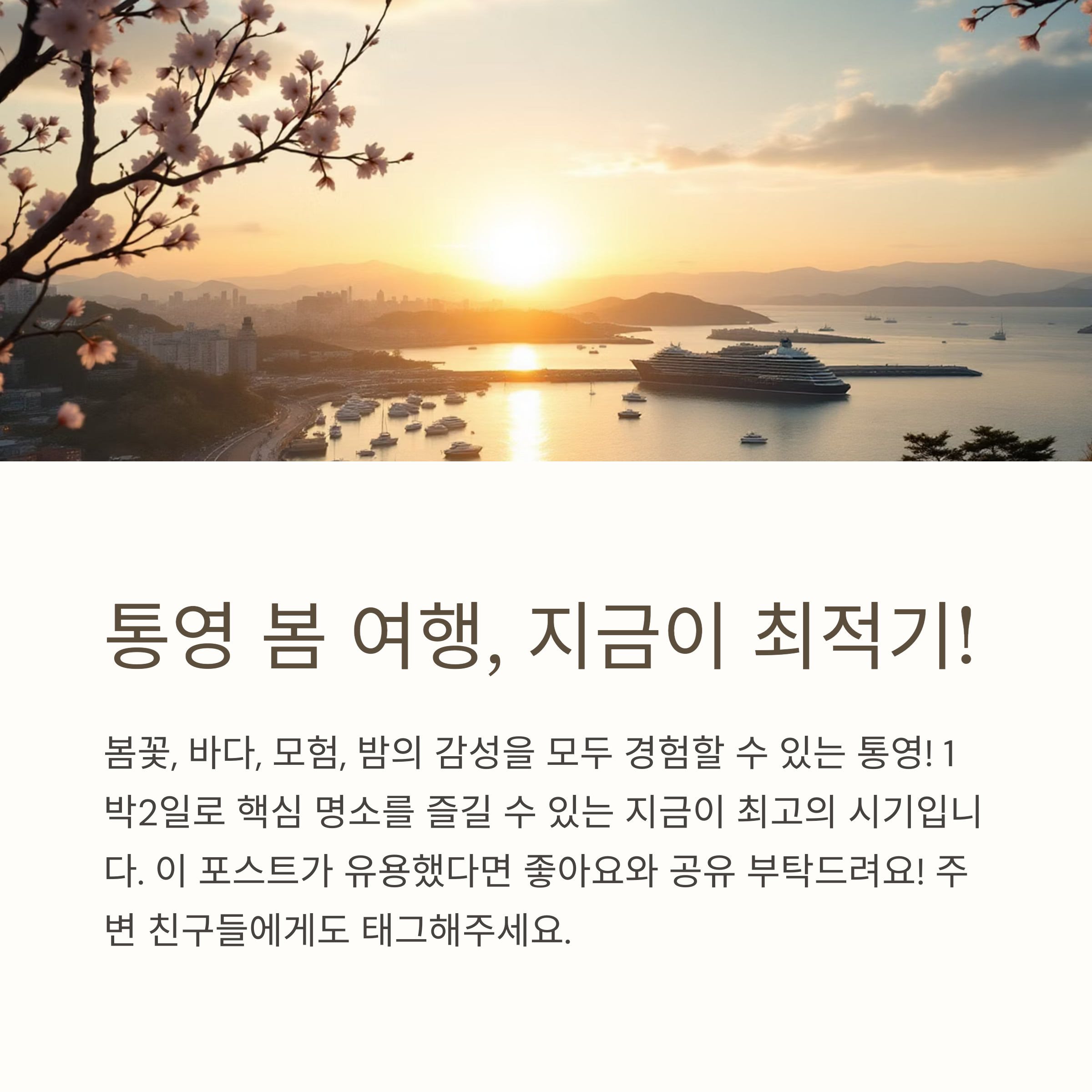 "4월과 5월, 국내여행을 계획한다면 통영을 선택하세요!"라고 자신 있게 추천합니다.