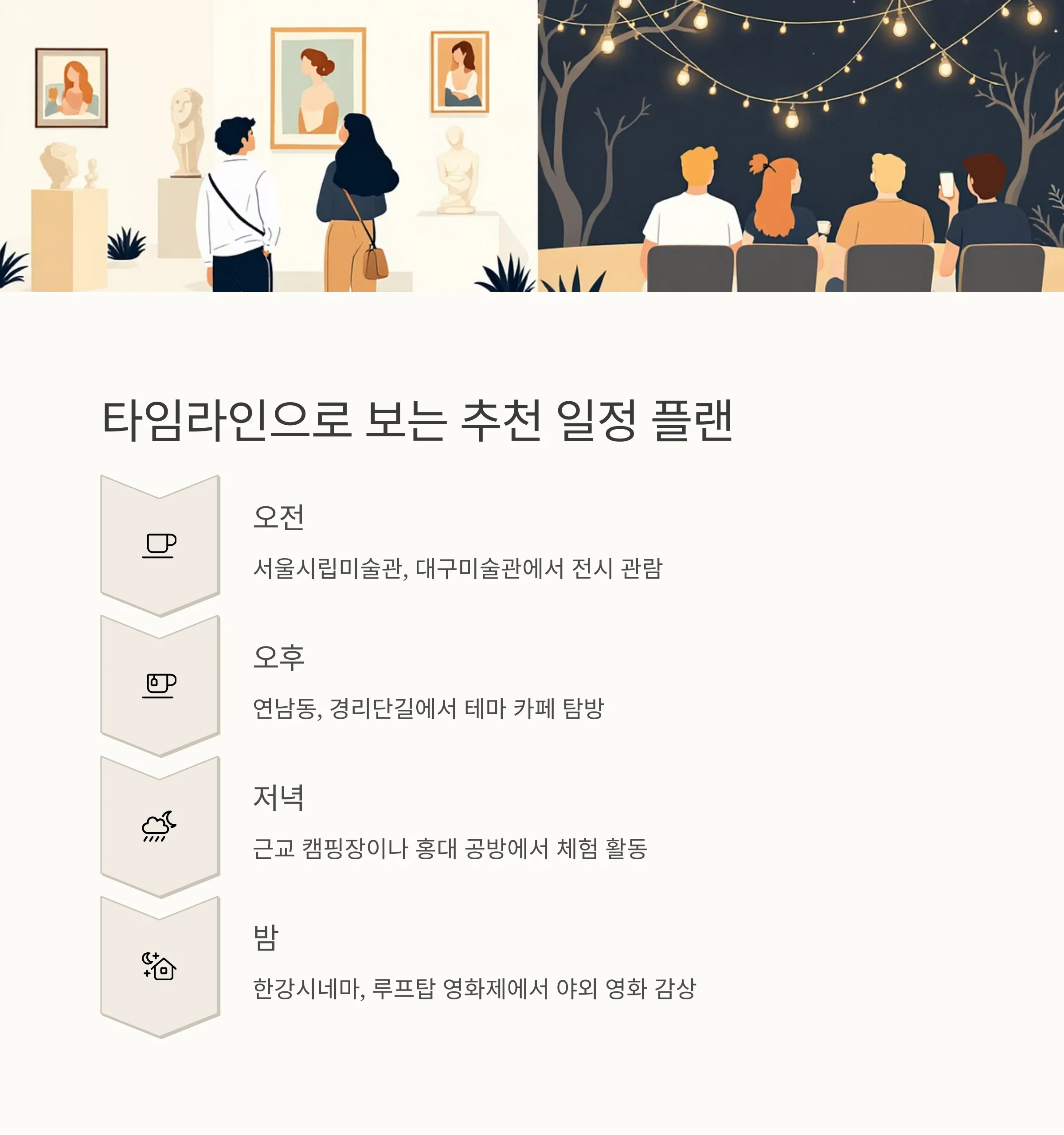 | 저녁 | 캠핑 or 공방 체험 | 근교 캠핑장, 홍대 공방 |